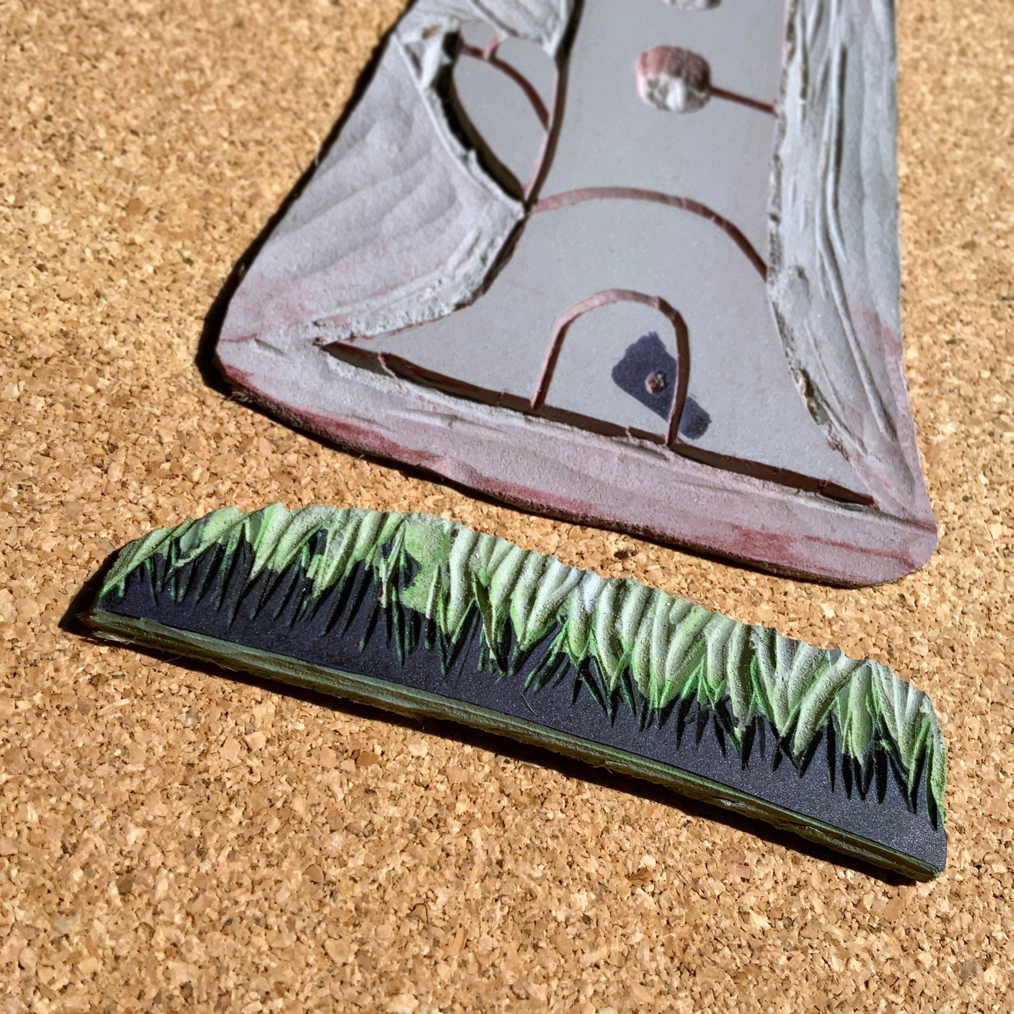 Printed with dark red and green oil-based inks and hand-finished with oil-based relief ink, ink pen, and colored pencil. Printed on 100% cotton Legion Somerset Satin paper.