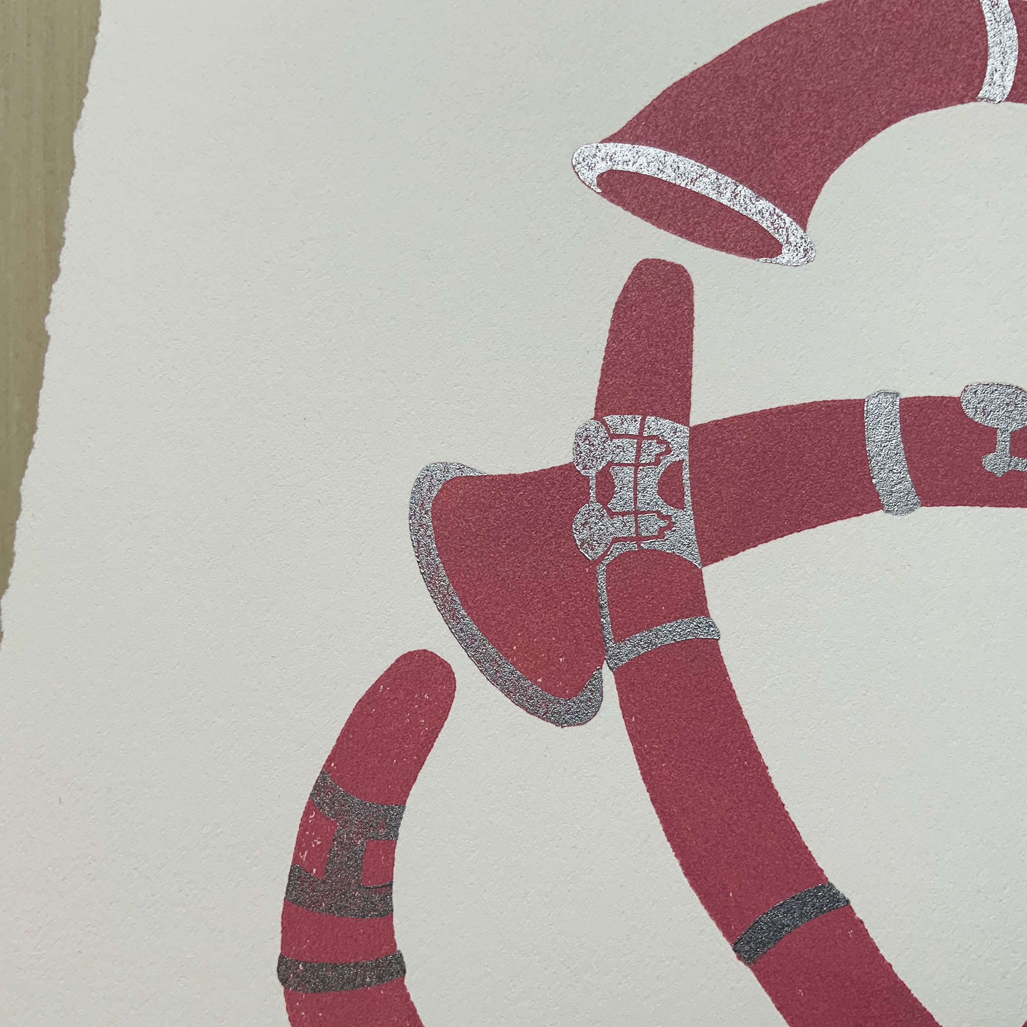 Printed with pink and metallic silver oil-based inks on robust, 100% cotton Legion Stonehenge paper with a hand-torn or deckled (feathered) edge. The metallic silver ink subtly reflects the ambient light.