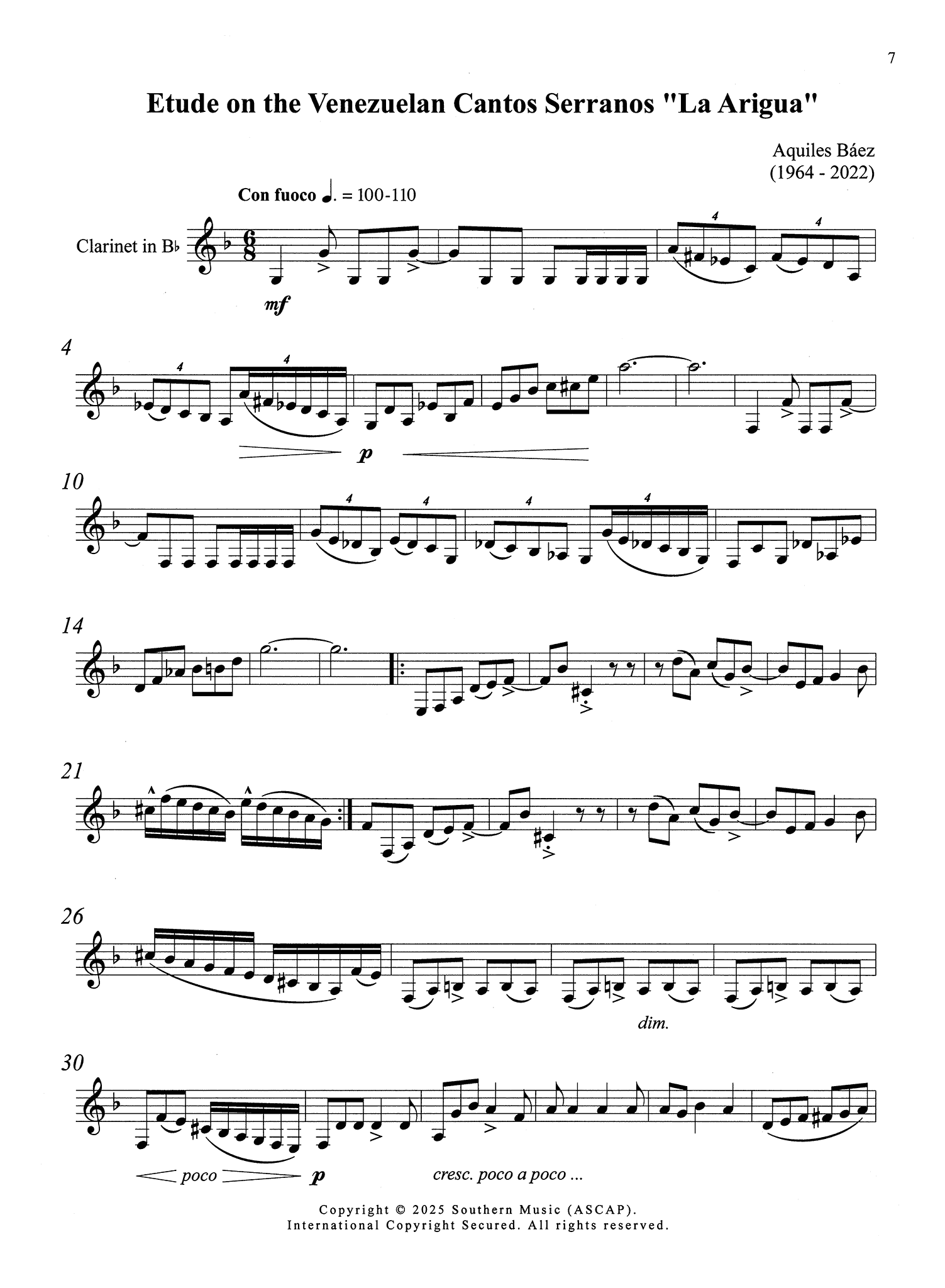 "These exceptional etudes for clarinet form an important development in Venezuela's musical heritage. Clarinet artist and educator Carmen Borregales commissioned twelve etudes from twelve outstanding Venezuelan composers who explore the country's popular music of traditional roots. Each etude draws from a specific genre of this music to demonstrate an innovative approach to technical practice and skill development for clarinet. Borregales provided composers with references for etude method books and the Venezuelan genres. In the editing process she contributed an extensive knowledge of expressive approaches and various musical details. She has recorded all twelve etudes to ensure each clearly demonstrated an aspect or technique from the overall pedagogical objectives (online playlist included). The results of their combined efforts form this comprehensive method book, 12 Etudes for Clarinet in Venezuelan Style. The method is devised for advanced-level players in developing pedagogical and performance practices."Readers are encouraged to consult Borregales' 2023 dissertation for context on Venezuelan music (as well as suggested fingerings for various études, found on pages 186–199).