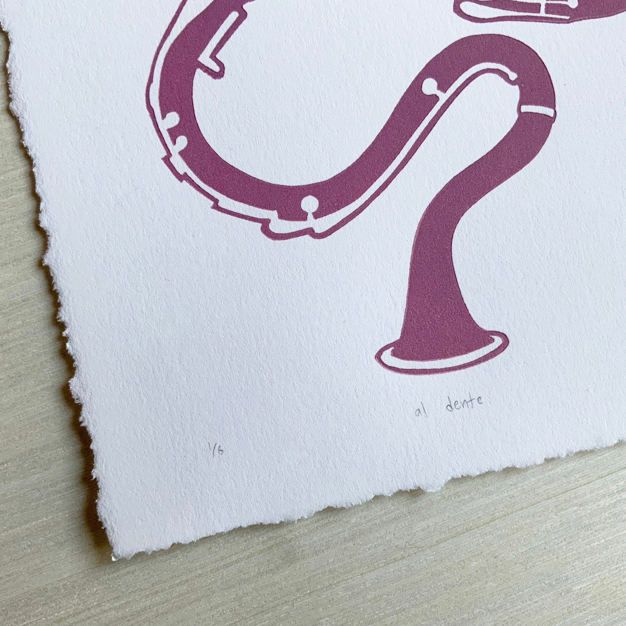 Printed with dark pink, oil-based ink on robust, 100% cotton Legion Stonehenge paper with a hand-torn or deckled (feathered) edge.