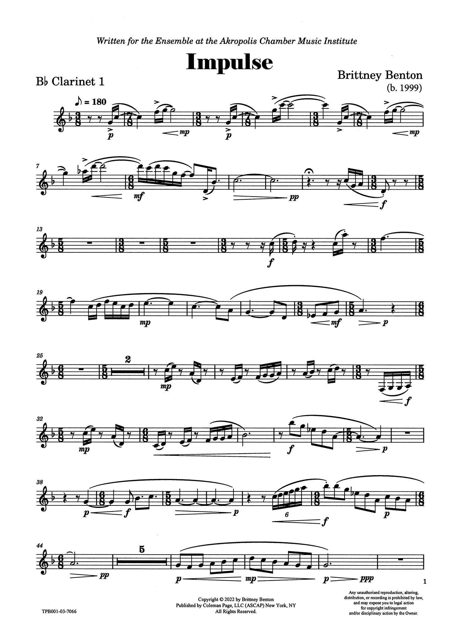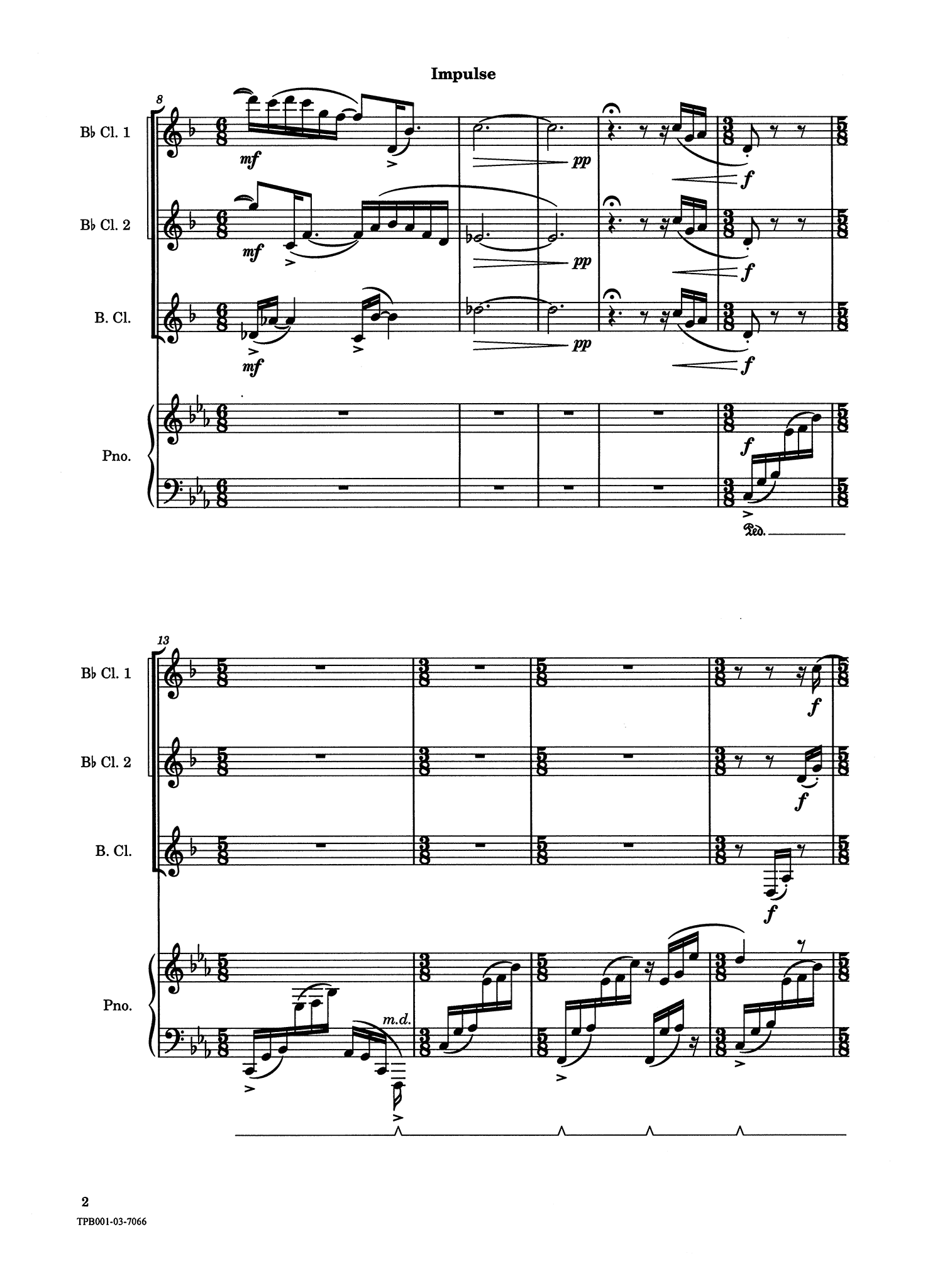 "Impulse focuses on syncopation, dovetailing, and changing time signatures. Accented notes poke their way through the texture. The melodies and accompaniment are often passed between all three clarinets, blending each of the instruments together while the piano provides the rhythmic glue that holds it all together through the changing time signatures. Each of these attributes led me to the name “Impulse”, as this piece impulsively propels itself forward." -