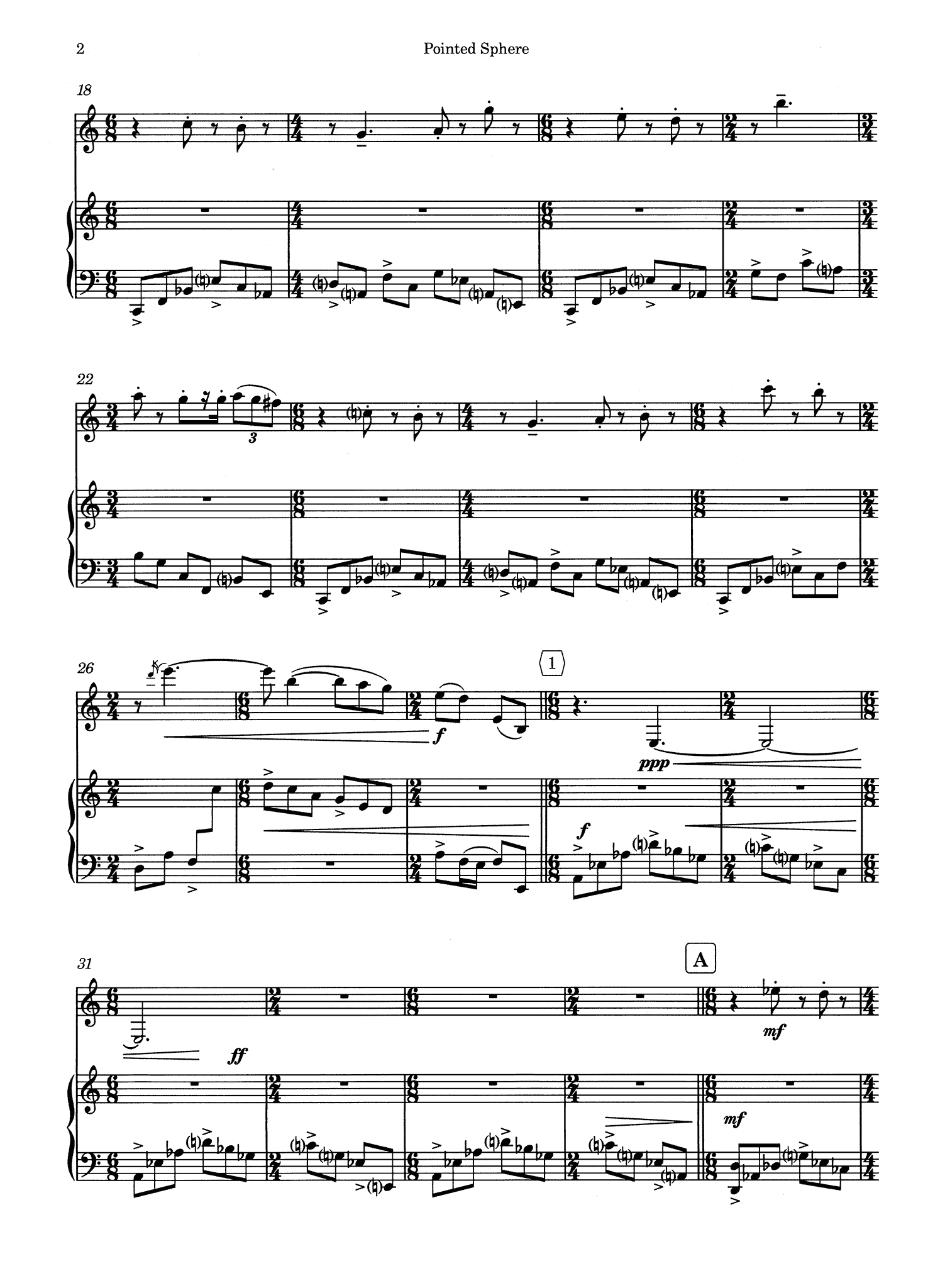 "Road Map: The sculpture that inspired this piece is, as the name implies, a spherical shape. Thus, I wanted to preserve this circular nature, as well as the reality of art perception; that is, there is no set duration of time when viewing physical art such as a sculpture. Therefore, there is no real 'end' to the piece, it could go on in a circle forever. I have provided three endings, or places to walk away from the sculpture, indicated by coda 1, 2, and 3. The piece should be played through once, and then one of these three exit points should be taken to their respective brief codas." -