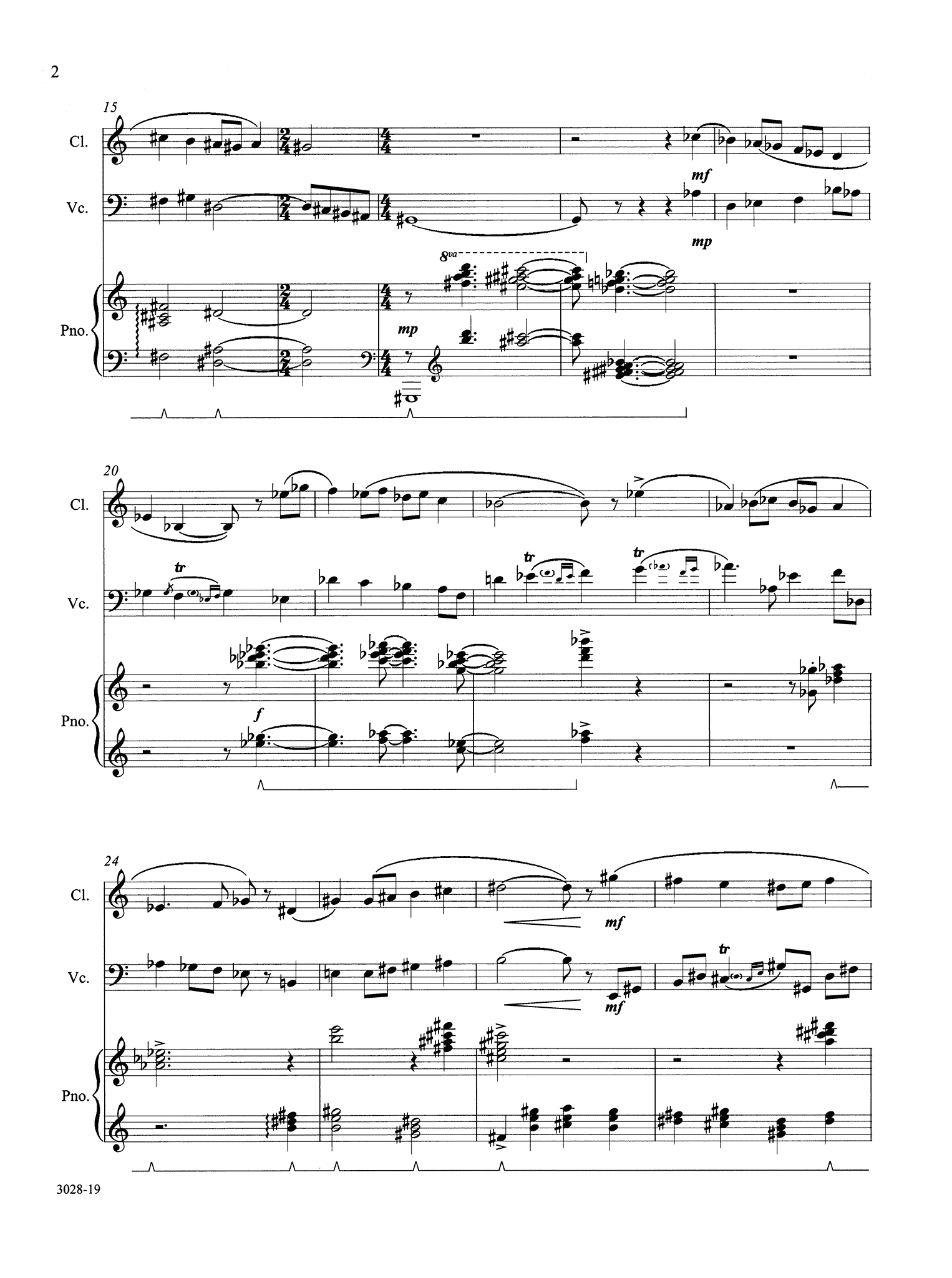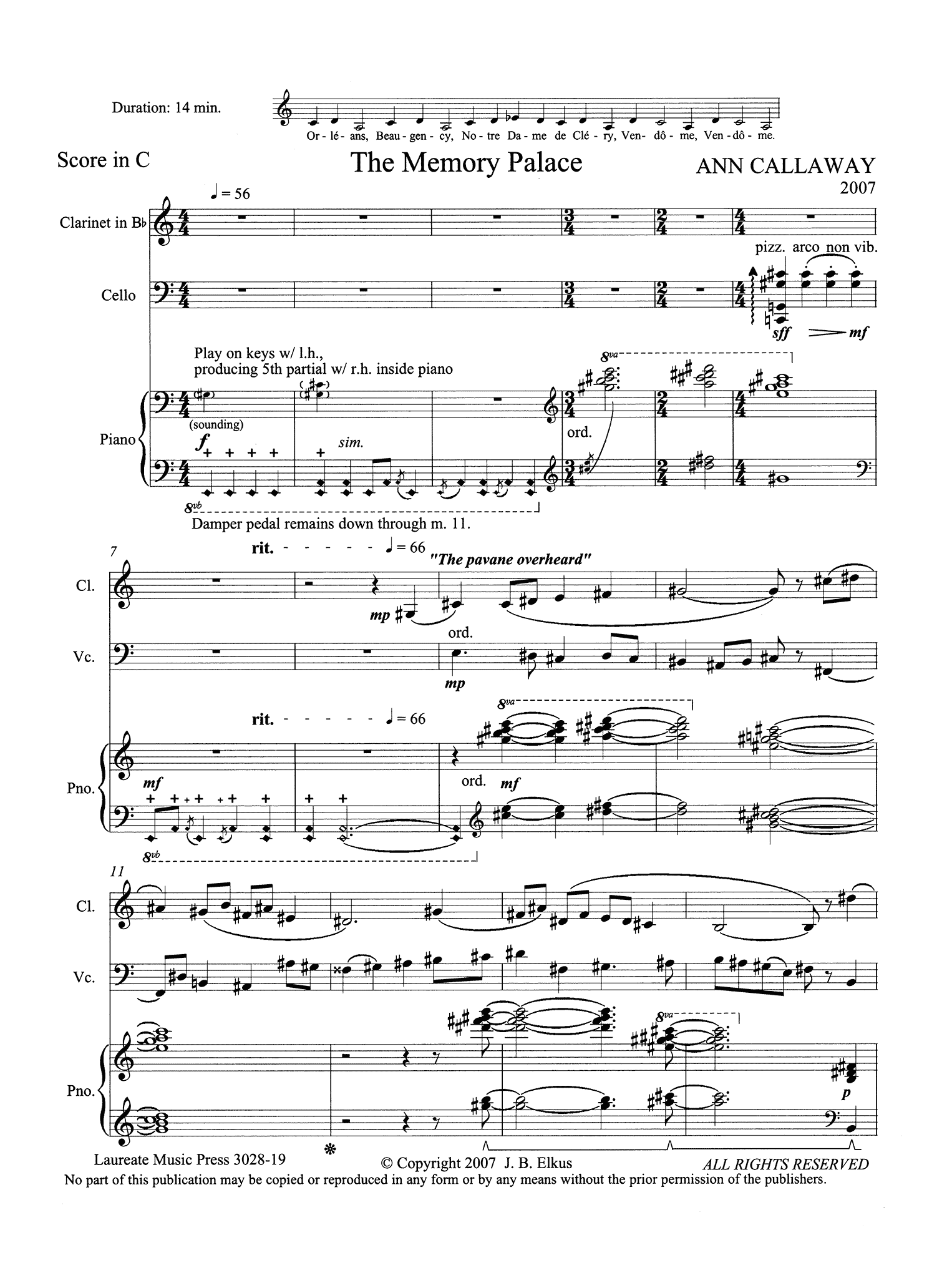 "At 6:00 on an evening in May several years ago, I happened to be standing on the ramparts of a castle overlooking the Main River and the old town of Wuertzburg. I counted at least ten church steeples in the town below, and it seemed as if the bells in each of them started ringing on the hour. I had never heard such deep, sonorous, booming bells.The evening was beautiful, the air soft, and I felt steeped in the centuries-old atmosphere of the castle. Later, on the flight home, I found myself working on some sort of “musical artifact,” and months later, it assumed the shape of a very long chorale tune, or perhaps a pavane, more suited to something I might have written if I had lived in the 1600’s. I used both the “pavane” and an idealization of the deep throbbing church bells of Wuertzburg as material for a theme and variations for clarinet, cello, and piano. There is an old French tune naming various churches (how that got into my Germanic fantasy, I can’t say) which suited my purposes, as well as some more “literal” chiming made by touching the nodes of strings in the contra-octave range of the piano, while the corresponding keys of those strings are struck. It is this effect which both opens and closes the piece."