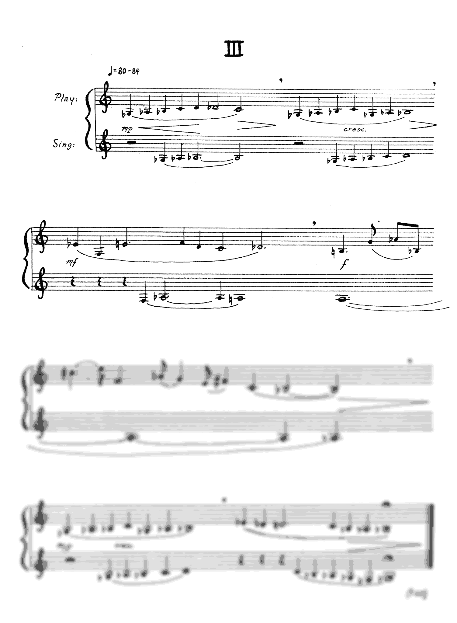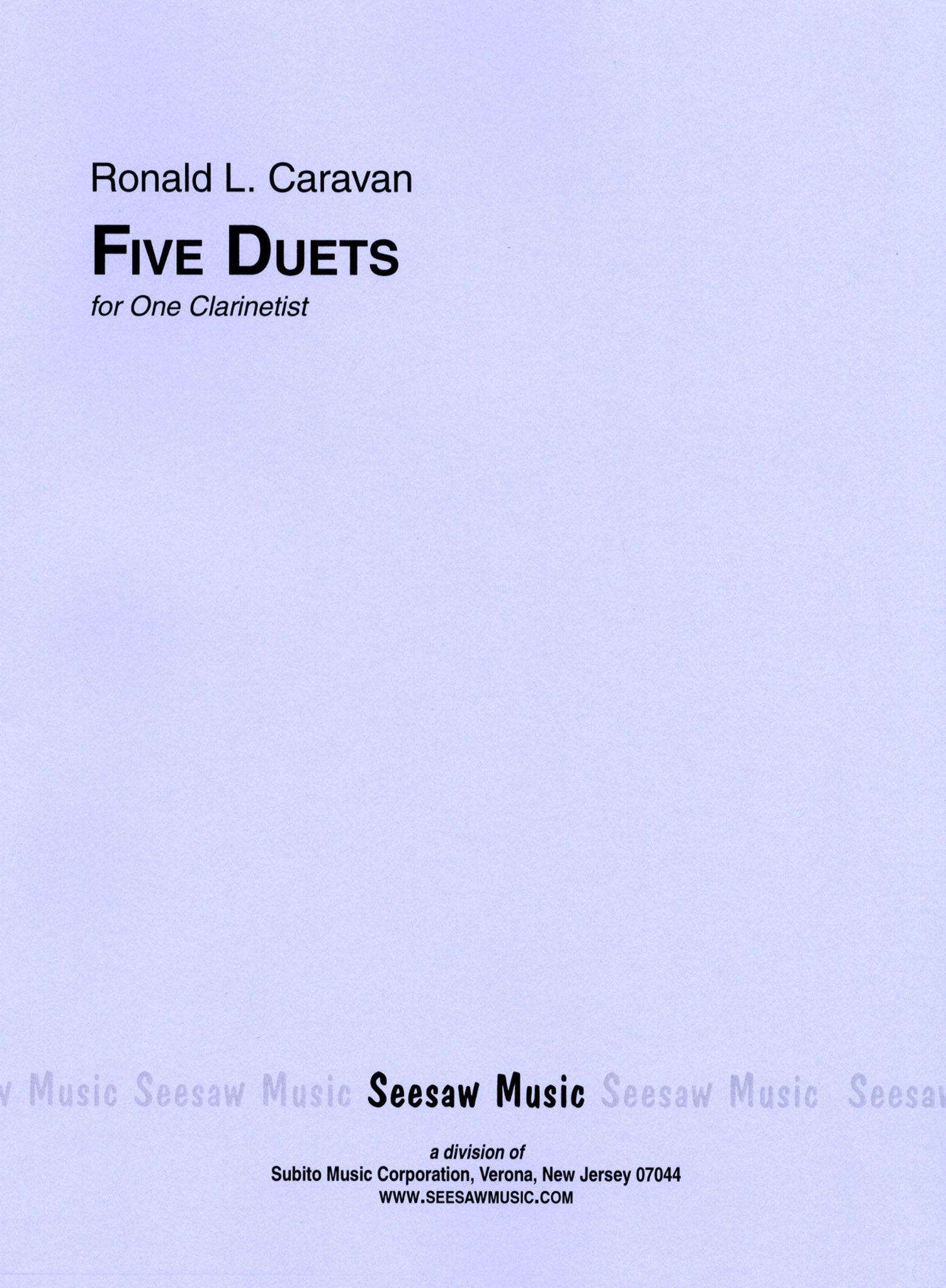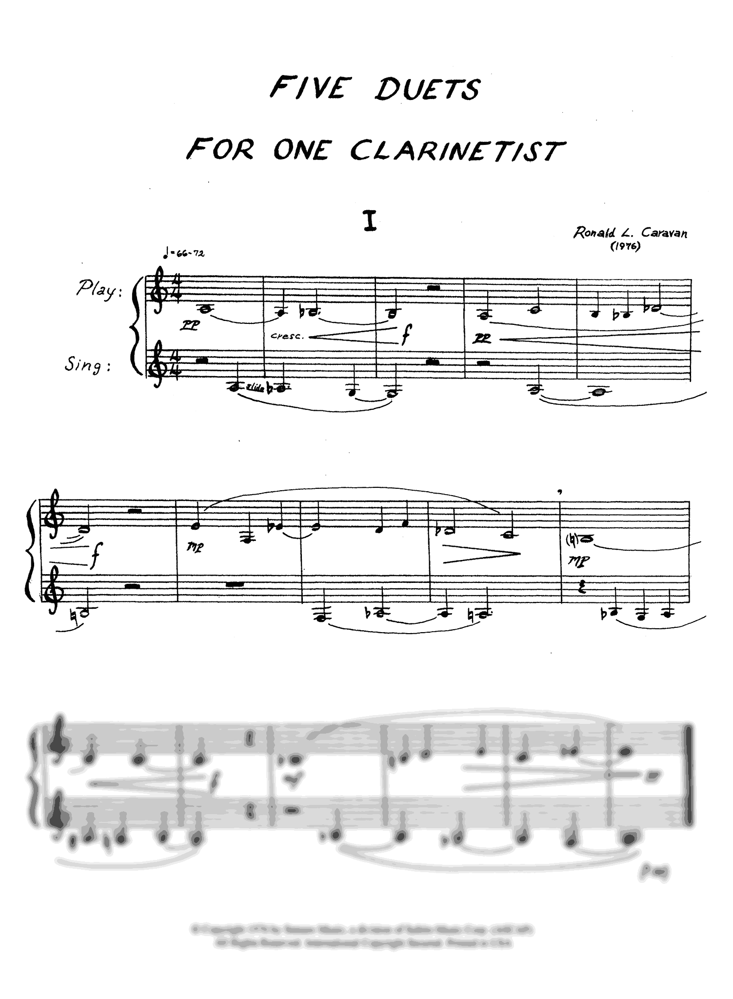 Five Duets for One Clarinetist is intended to be a five-movement work for performance in its entirety. However, the duets are constructed so that they may also be useful as study pieces, serving to assist the performer or teacher in his endeavors to gain flexibility in producing tones with the instrument and the voice simultaneously. The voice parts are written in a rather narrow tessitura and move primarily in whole steps and half steps."