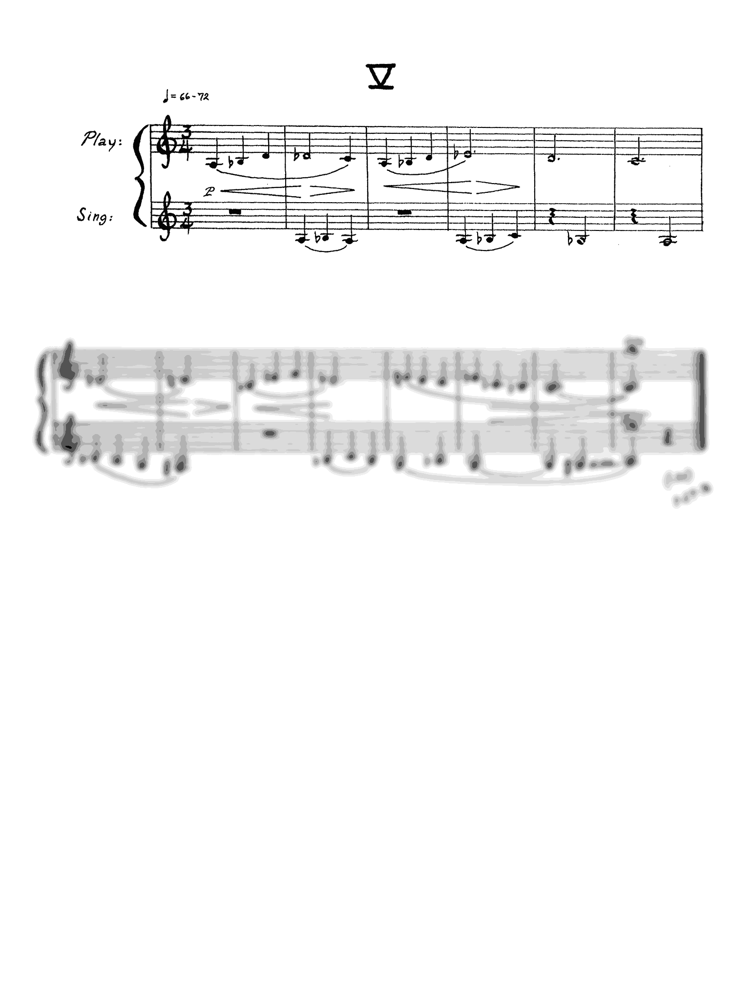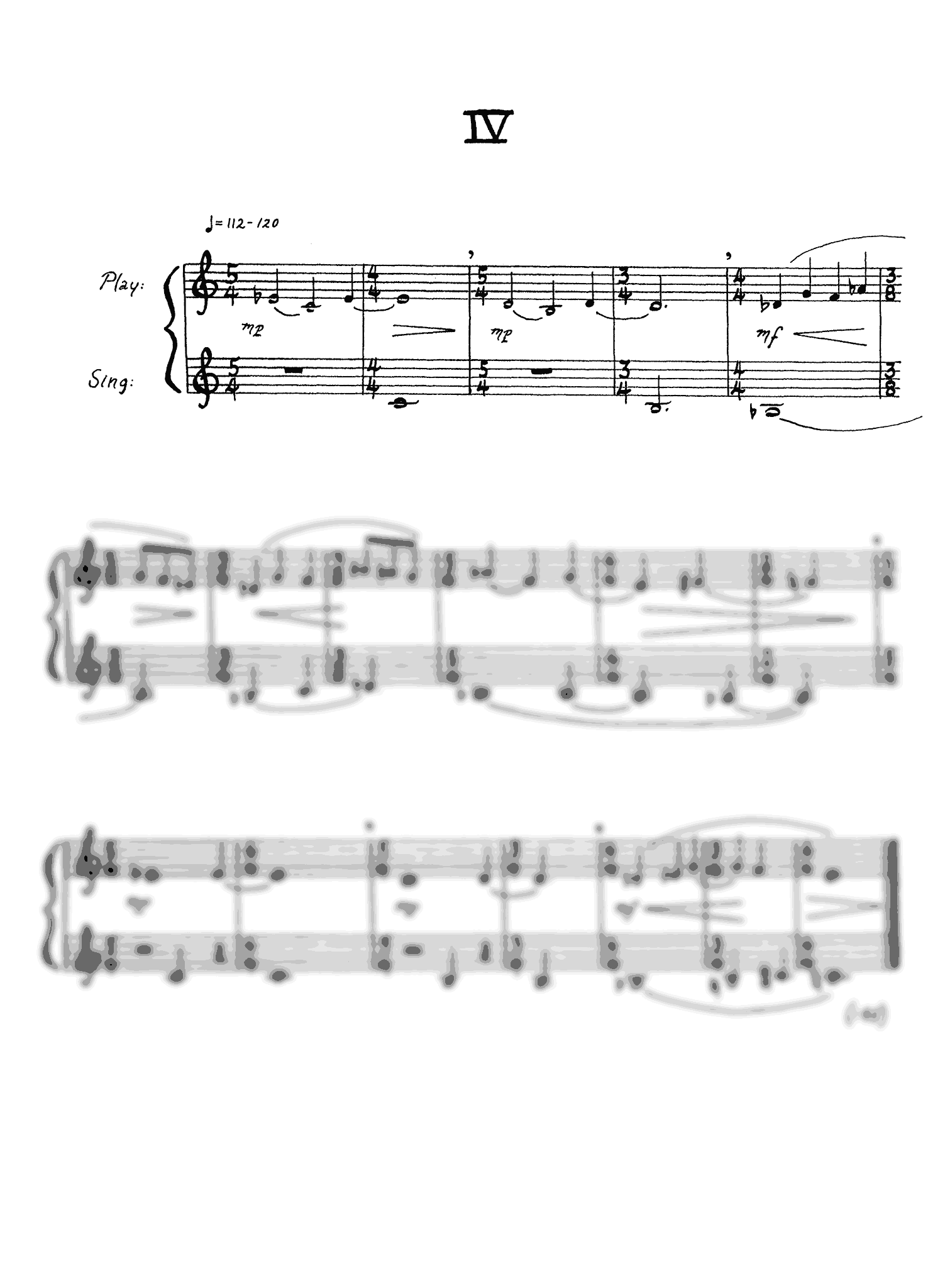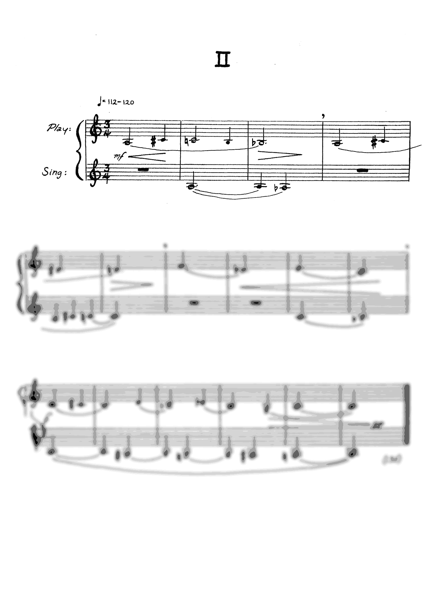Five Duets for One Clarinetist is intended to be a five-movement work for performance in its entirety. However, the duets are constructed so that they may also be useful as study pieces, serving to assist the performer or teacher in his endeavors to gain flexibility in producing tones with the instrument and the voice simultaneously. The voice parts are written in a rather narrow tessitura and move primarily in whole steps and half steps."