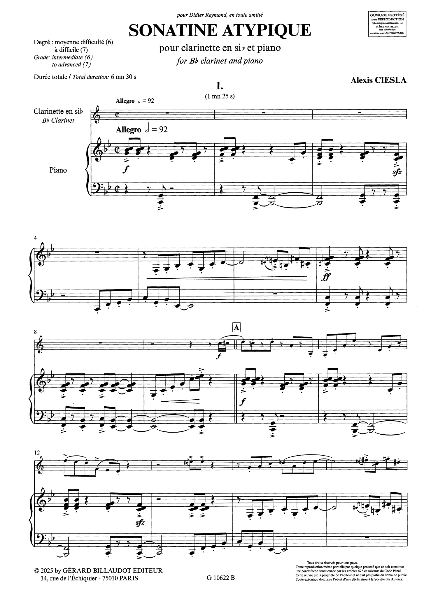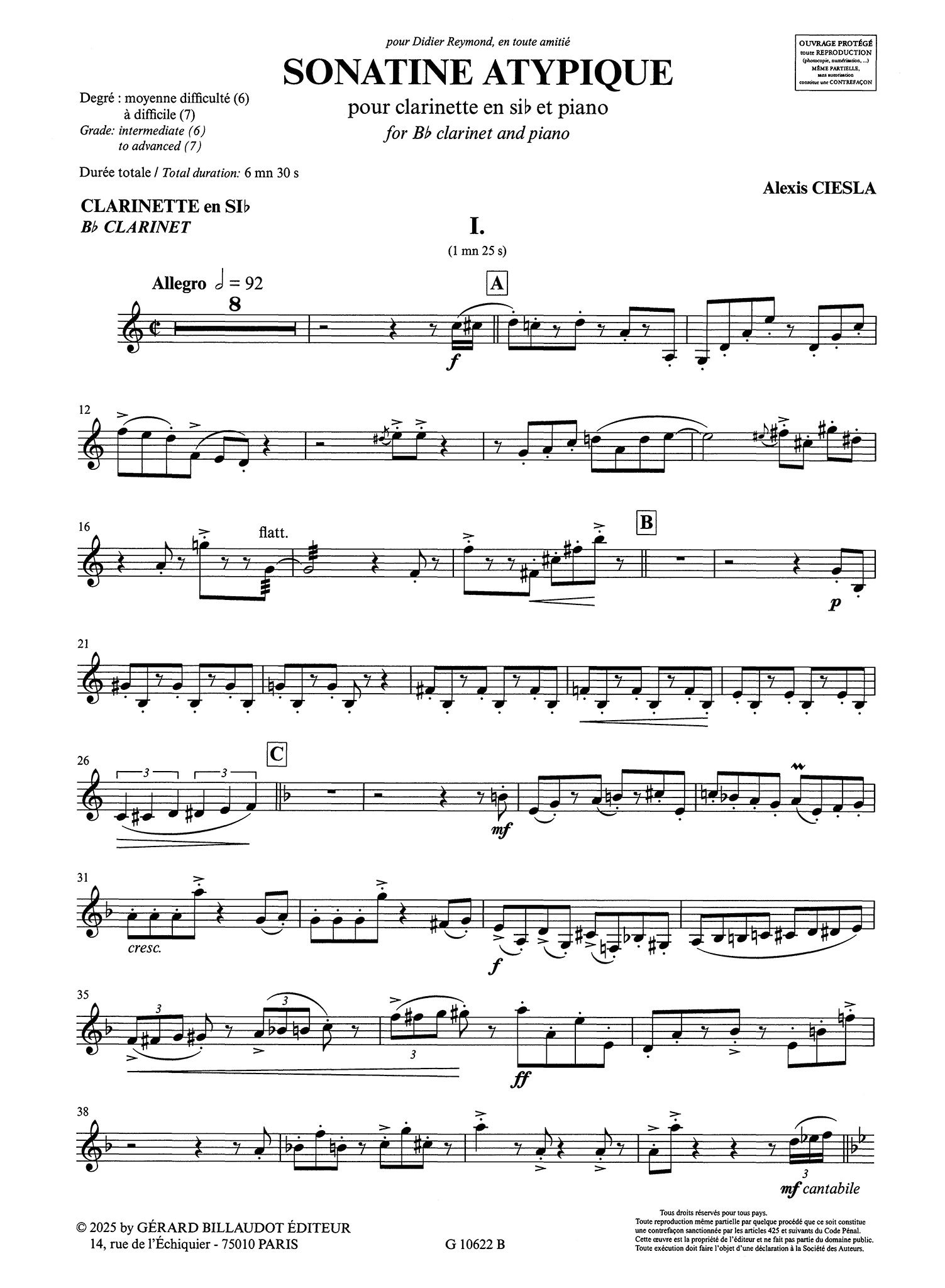 "Sonatine atypique is 'atypical' because of the diversity and contrasting characters of its three movements.In the brisk first movement, marked by its extreme rhythmic precision, the clarinet and the piano seem to engage in a fun chase. A brief middle section, softer and expressive, lets things calm down before resuming the chase, even faster this time!