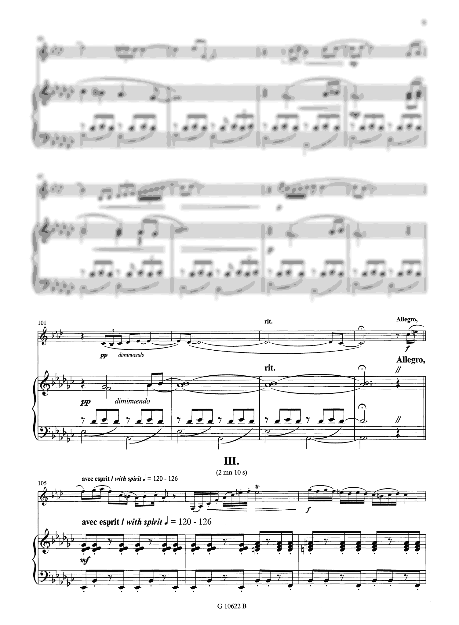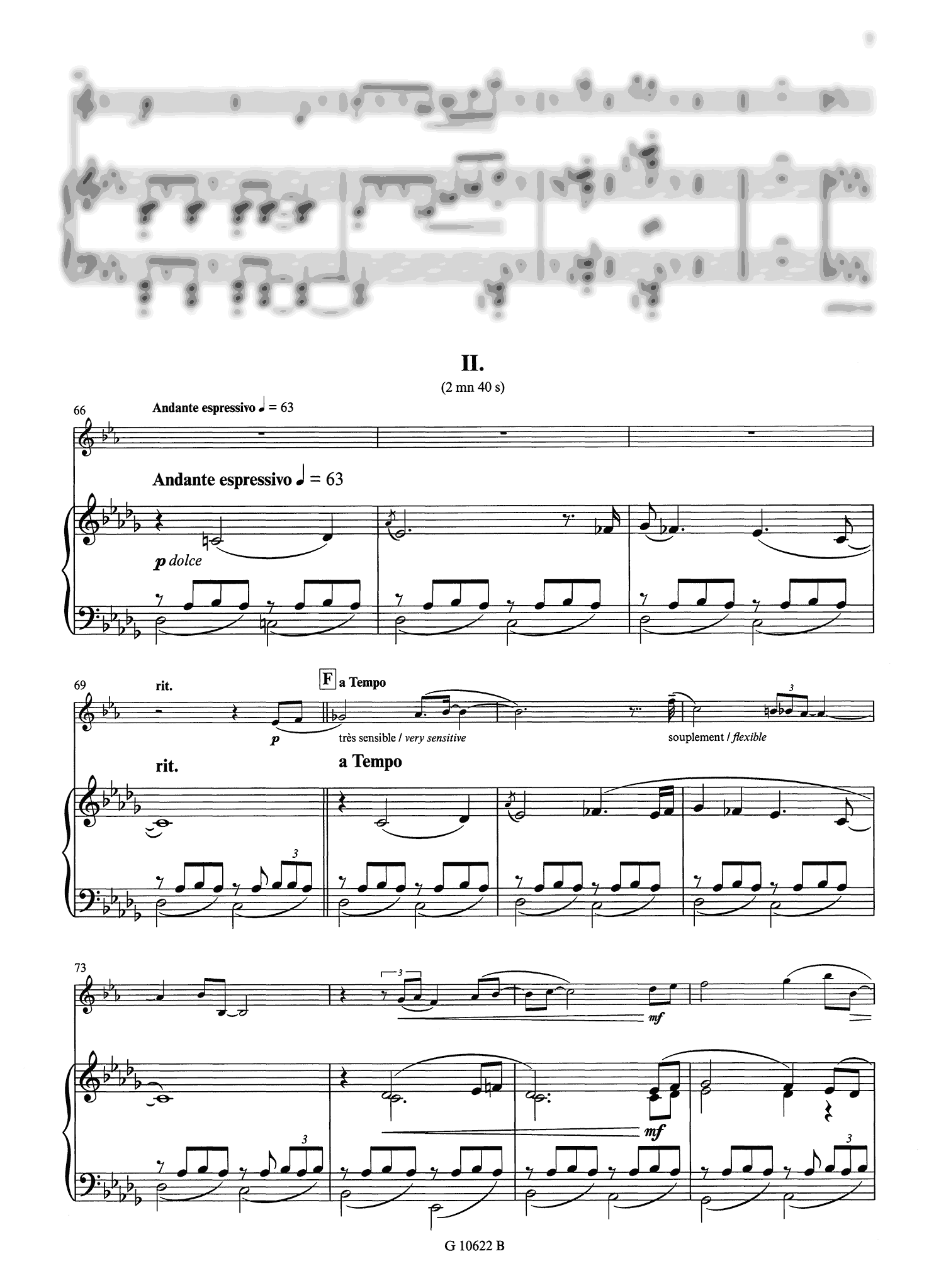 The second movement, much more relaxed and expressive, moves along a left-hand ostinato pattern in the piano part. The solo part is quite expressive, albeit reserved as its dynamic palette ranges only from p to mf.
