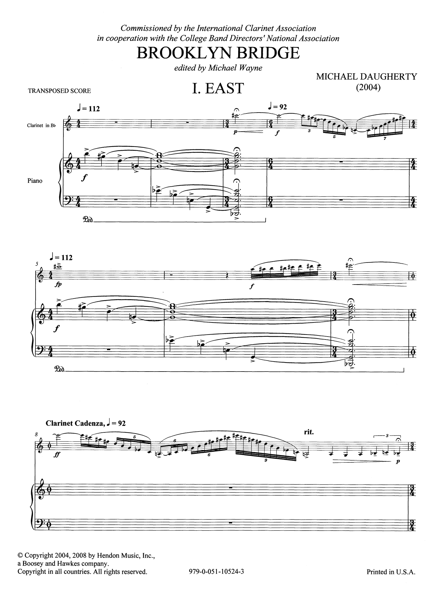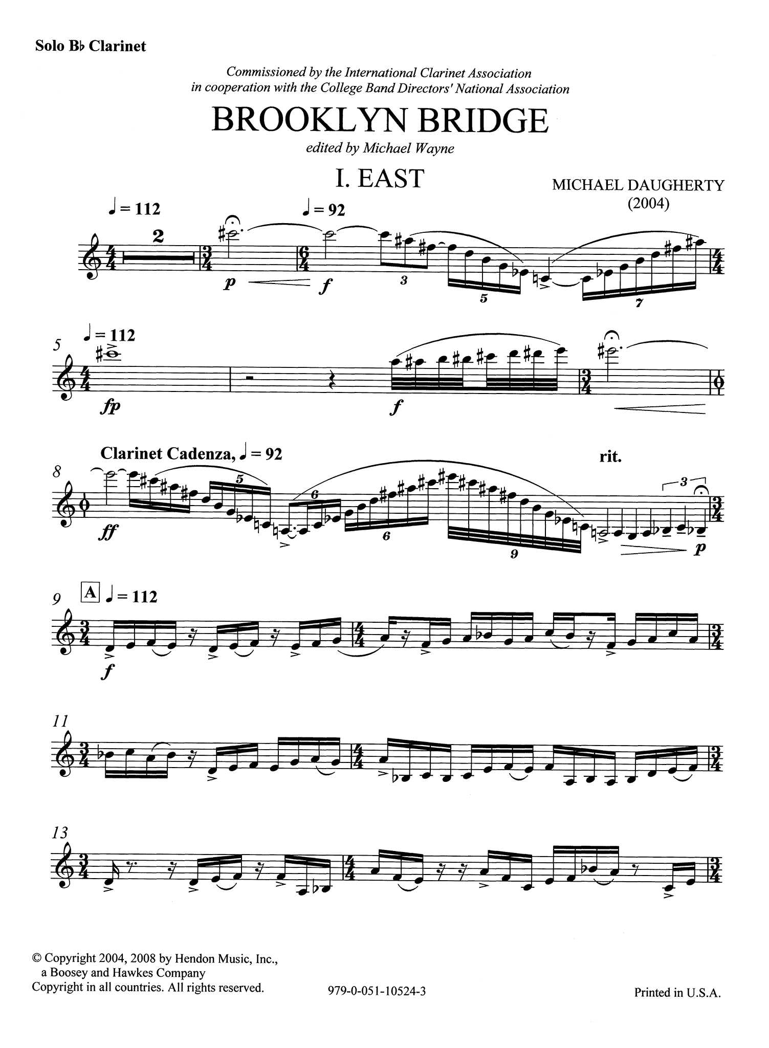 "Designed by John Roebling (1806-1869), the Brooklyn Bridge endures as the most admired and best-loved bridge in New York City. After the opening of the bridge to the public in 1883, Harper’s Monthly reported, “The wise man will not cross the bridge in five minutes, nor in twenty. He will linger to get the good of the splendid view about him”. As I have lingered and walked across the Brooklyn Bridge over the years, the stunning vistas of the New York skyline have inspired me to compose a panoramic clarinet concerto.Like the four cables of webs of wire and steel that hold the Brooklyn Bridge together, my ode to this cultural icon is divided into four movements. Each movement of the clarinet concerto is a musical view from the Brooklyn Bridge: I. East (Brooklyn and Brooklyn Heights); II. South (Statue of Liberty); III. West (Wall Street and the lower Manhattan skyline which was once dominated by the World Trade Towers); IV. North (Empire State Building, Chrysler Building, and Rockefeller Center). In the final movement of the concerto, I also imagine Artie Shaw, the great jazz swing clarinetist of the 1940s, performing with his orchestra in the once glorious Rainbow Room on the sixty-fifth floor of the Rockefeller Center."