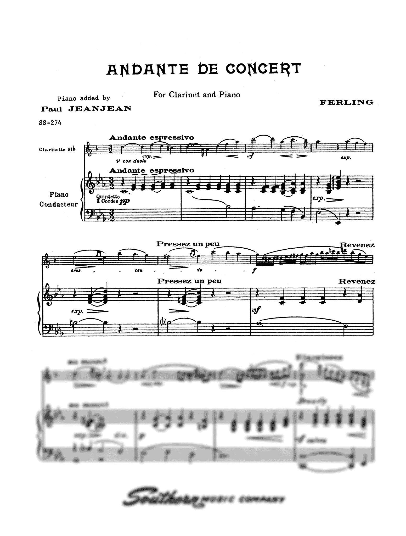 This edition consists of a clarinet and piano arrangement of Étude No. 27 from Ferling's 48 Études, Op. 31, adapted by Paul Jeanjean. Readers familiar with the Rose 32 Études will recognize this as Étude no. 11, although although they should be aware that while Jeanjean’s adapation does employ Rose’s 3/2 time signature (as opposed to Ferling’s 3/4 time), the clarinet part notates some ornaments and rhythms according to the original Ferling, which are not seen in the Rose. Its ending is also extended by three measures, finishing with a pair of Lento ascending arpeggios.