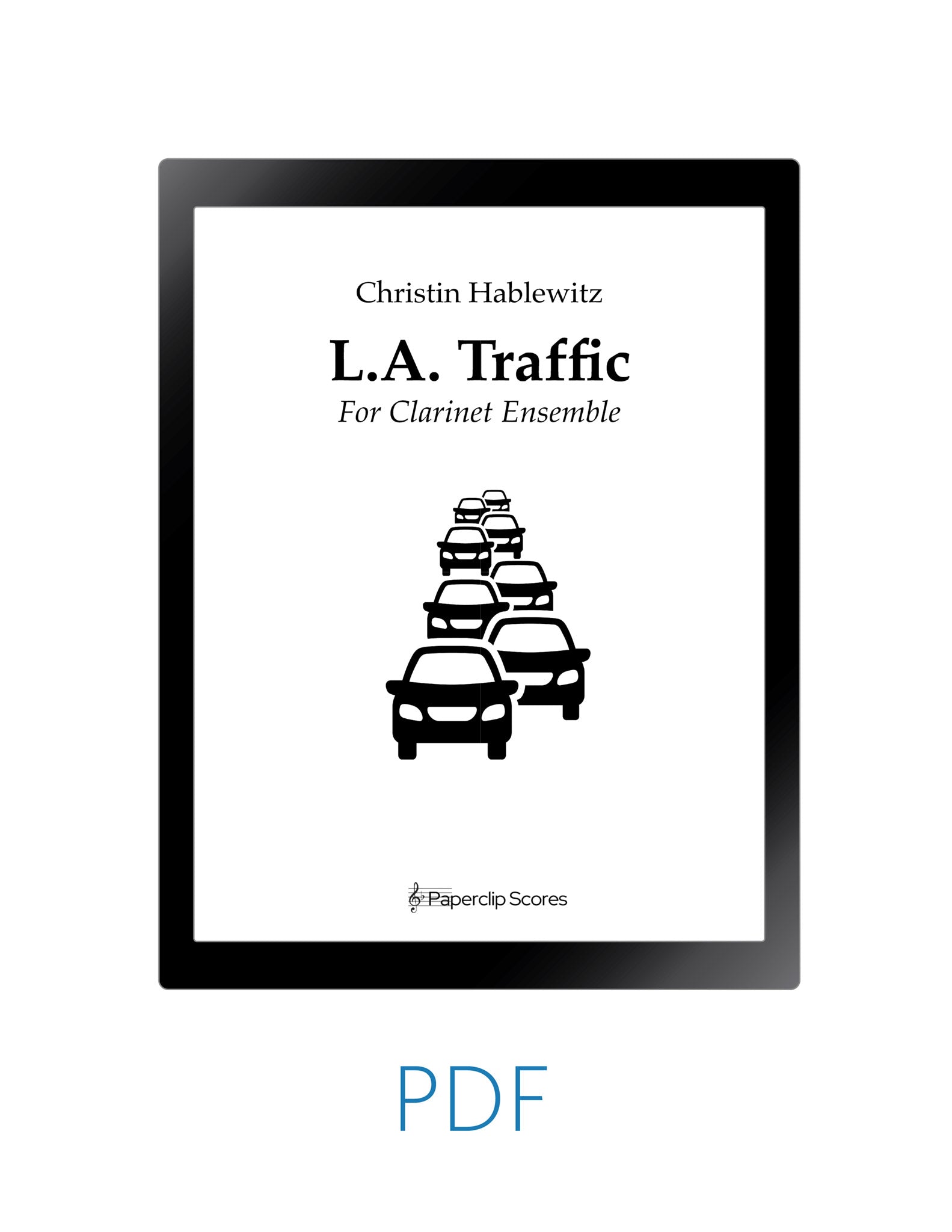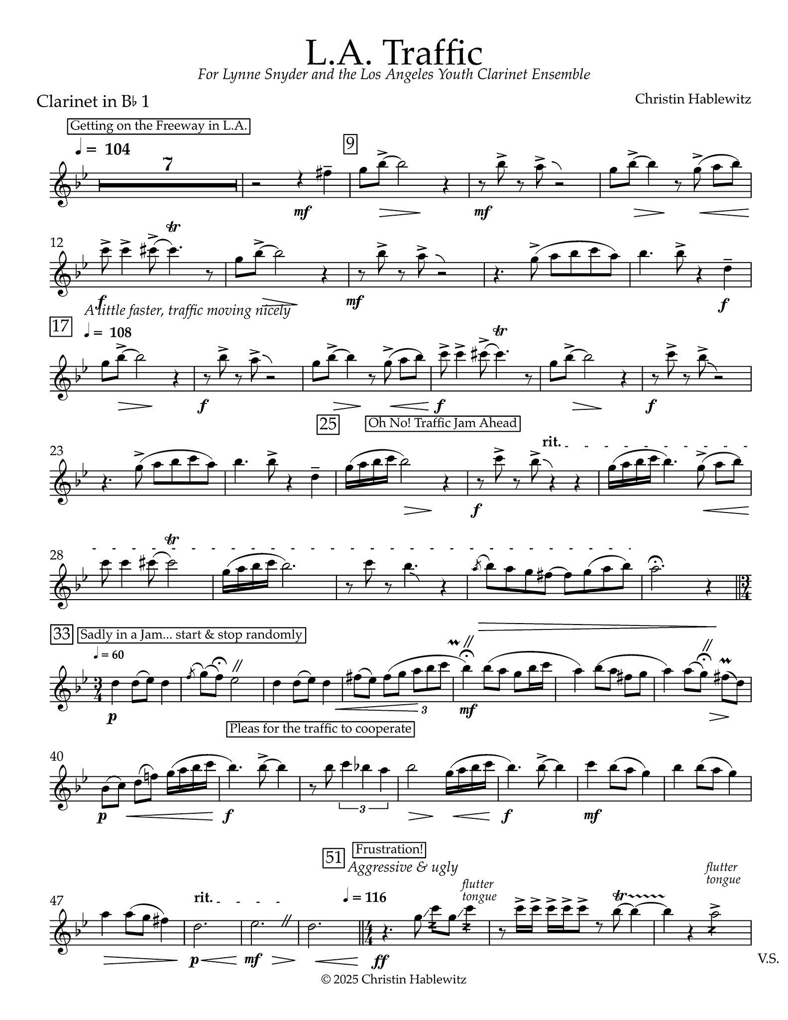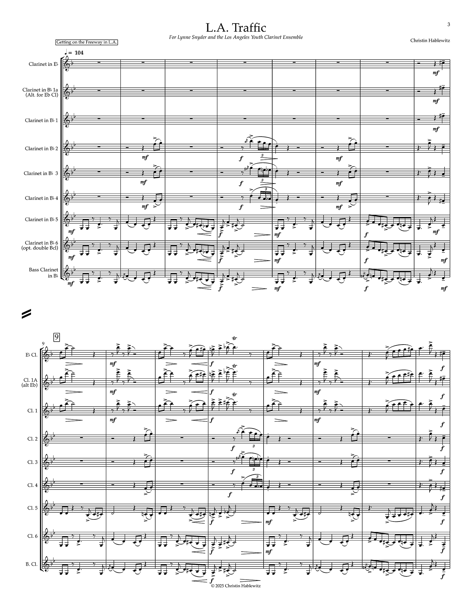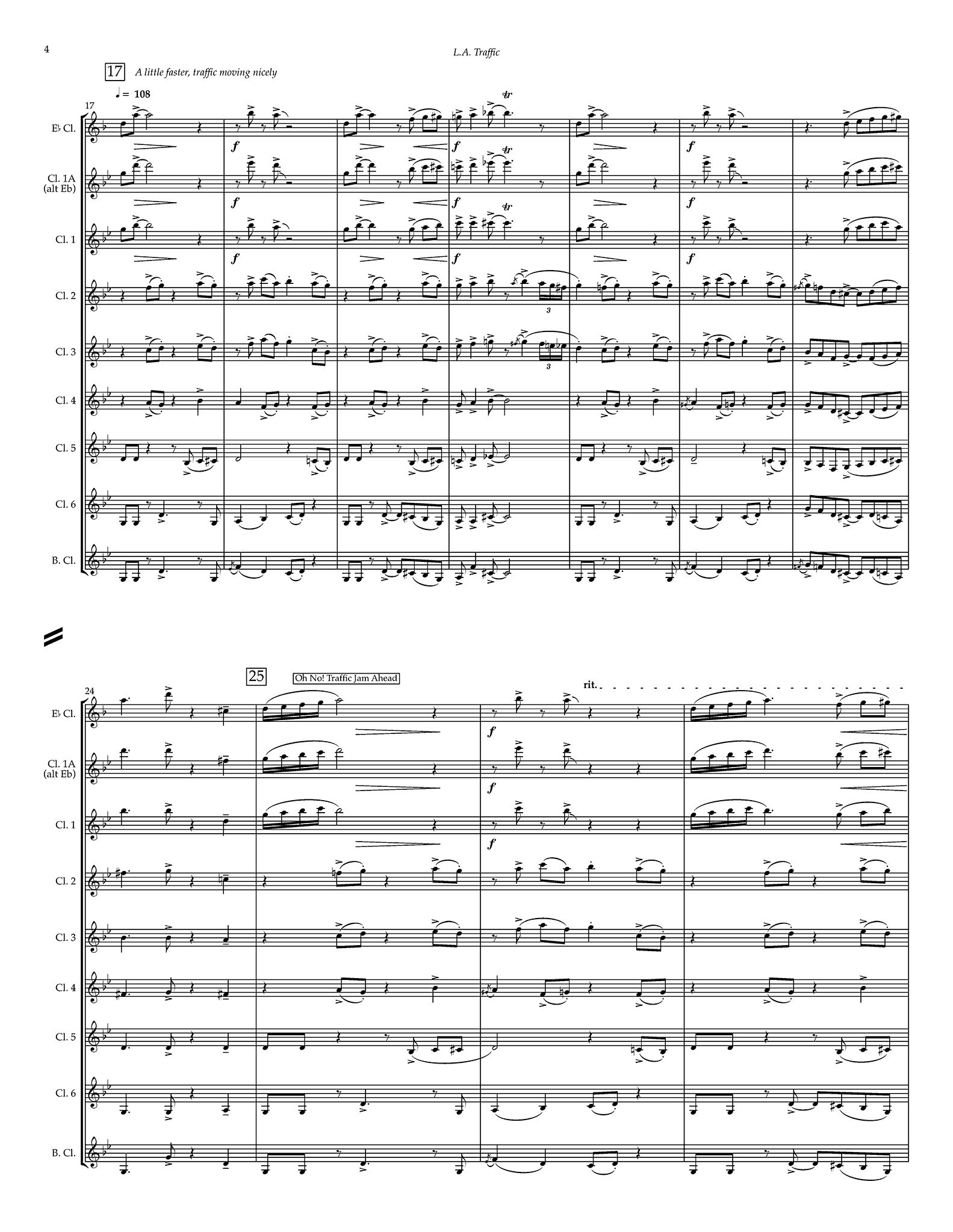 "When you think of Los Angeles one thing comes to mind is TRAFFIC. Los Angeles has some of the worst traffic in the world. This car reliant metropolis is full of people, cars, neighborhoods, hills and freeways make driving in LA pretty much miserable. The cute clarinet choir piece is programmatic work that sonifies the experience of driving on the L.A. freeway complete with a happy driving groove, exaggerated slow down, frustrated outbursts, pleas for better traffic and unexpected starts and stops! This intermediate level piece was written for the Los Angeles Clarinet Youth Ensemble and they really understand the meaning of "bad traffic". The prominent bass clarinet groove really tries to keep the traffic moving forward, but does not always succeed. I hope this will be fun for both the players and audience, an experience we can all relate to!" -