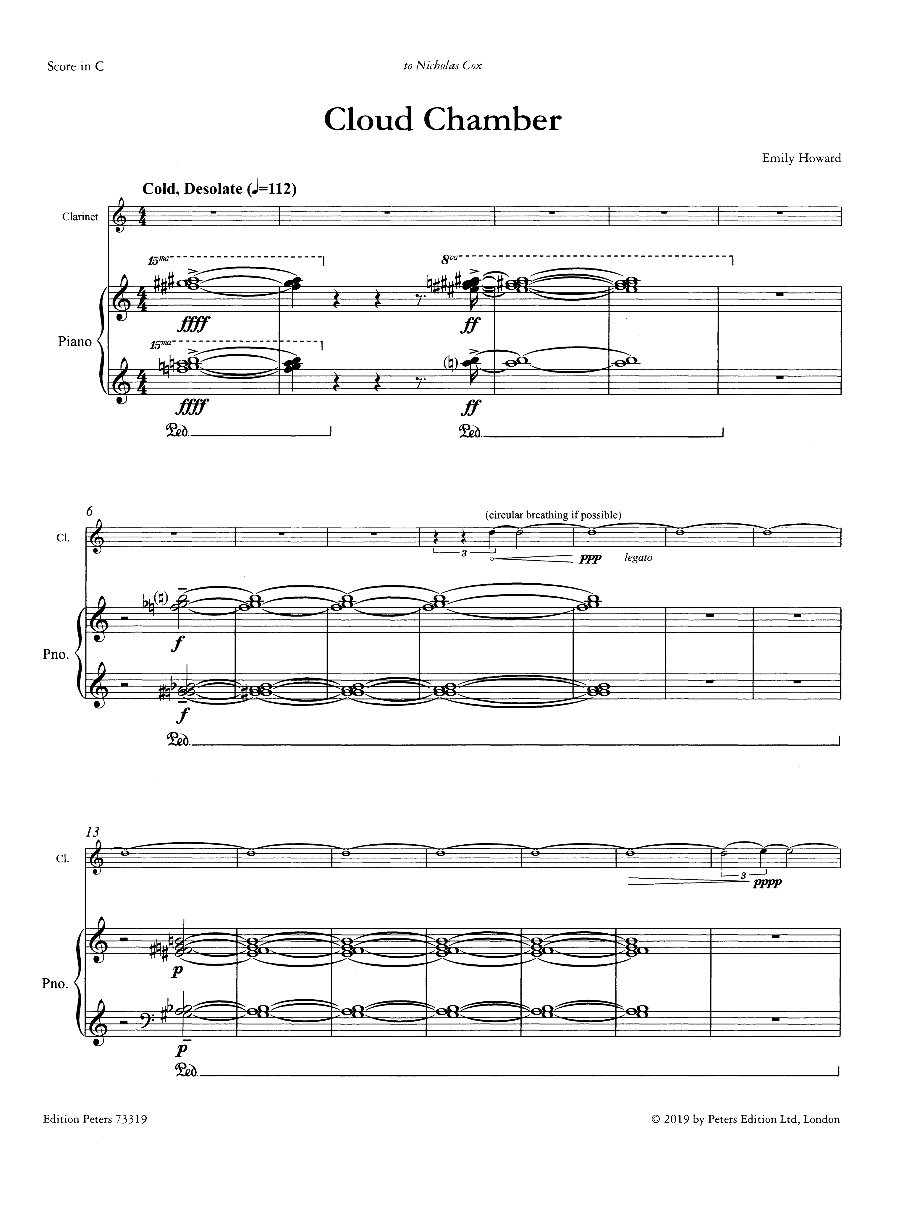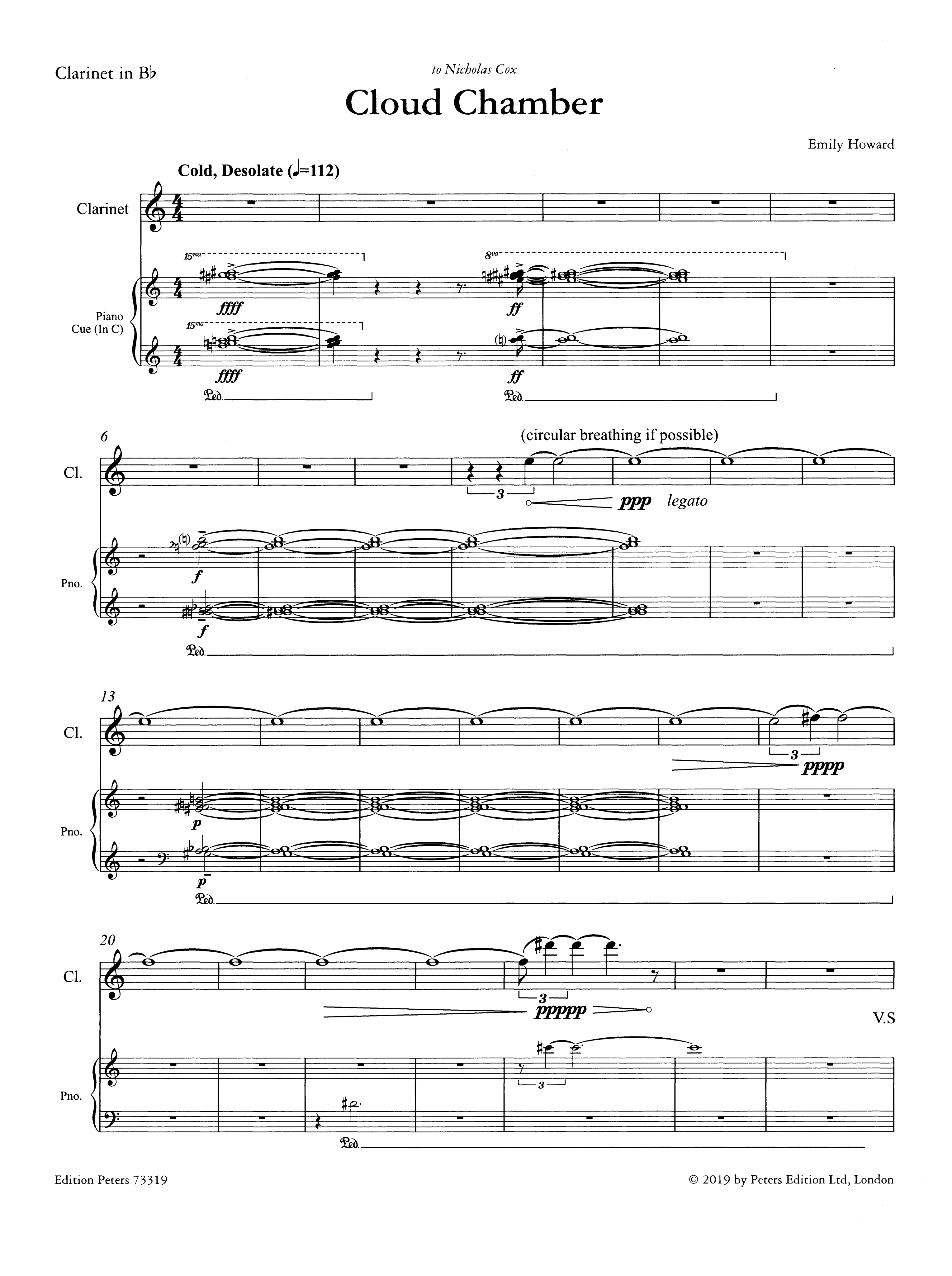 "Cloud Chamber is a short piece for clarinet and piano inspired by the scientific apparatus of the same name. Use for detecting particles of ionising radiation, a cloud chamber is a closed environment containing a supercooled supersaturated water vapour. When a particle interacts with the vapour, it ionises the vapour, causing the resulting ions to act as condensation nuclei around which a mist will form. The high energies of these particles mean that a trail is left behind because the number of ions produced along the path of the charged particle. The tracks have very distinctive shapes and this makes it possible to tell the difference between the tracks of, for example, alpha and beta particles. In my composition, the instruments trace the tracks left by an imaginary particle on a lonely and solitary journey through a cloud chamber."