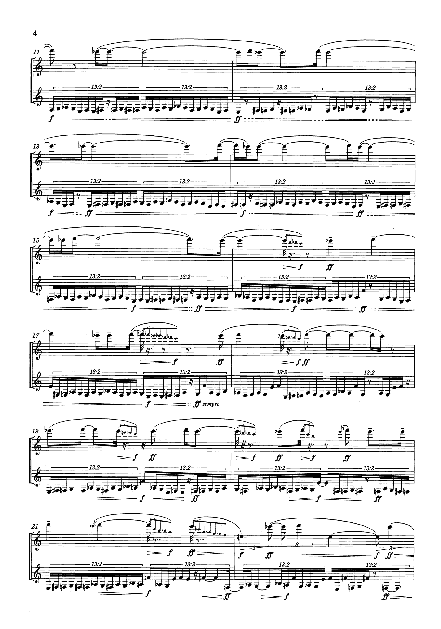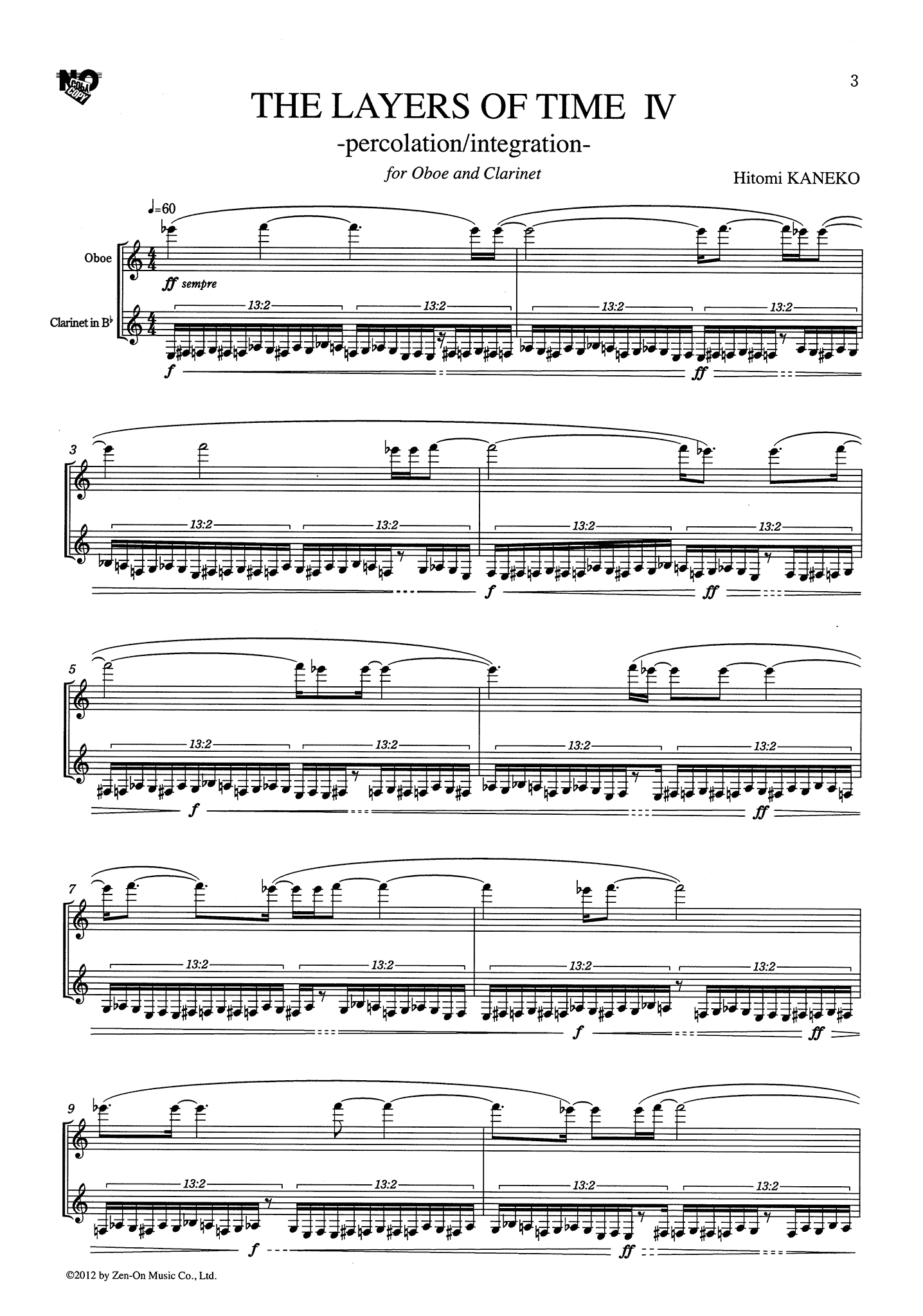 "This is the fourth work of the series of The Layers of Time, which is written for the oboe and the clarinet. The oboe and clarinet belong to the same category of woodwind instrument and look alike each other. But there is the defining difference between them; the oboe is a double reed instrument and the clarinet is a single reed instrument.The the layers of time, which is a main idea of this series, the two instruments emphasize their respective characteristics, and, at the same time, one percolates into the other. In addition, both of them produce new tone colors and rhythm by mixing each other."