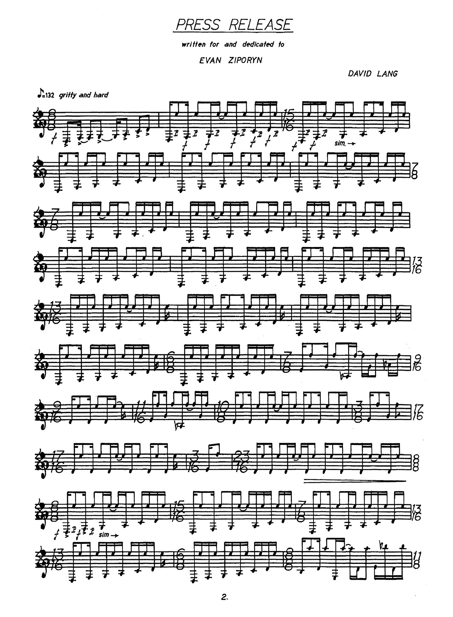 "I wrote Press Release in 1991 for Evan Ziporyn. When you compose for one person, you can’t get all the colors that you’d have with an ensemble or orchestra, so you have to imagine some sort of interesting problem. I wanted to do something that was really rhythmic. The original idea behind this piece was that of a high melody alternating with a low bass line, so that you get a high pop and a low pop switching back and forth as fast as possible, and these two worlds coexist. I wanted the upper melody to be recognizable and the bottom bass line to be recognizable, to be a real bass line, a driving funk thing. In classical music, the bass is only there to support the melody, which is where the action is. But the bass line is the place where funk music really shines. Who has the best bass lines in the business? I am a big James Brown fan, and, I thought, if you want a bass line, you got to go to James. So I made the key changes sound like James Brown. Because of the way the bass clarinet works, I thought you’d have to press the keys down to make all the low notes, and you’d release the keys to make the high notes…. Press Release. I was really proud of myself because I thought I had made this funny joke, and then of course Evan said, ”You know, a lot of those high notes you play with all your fingers down, and a lot of those low notes you play with all your fingers up.” But I didn’t think it was worth it to change the title." -