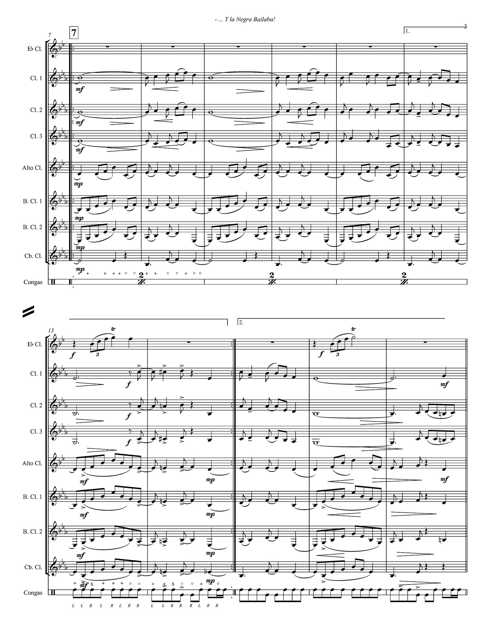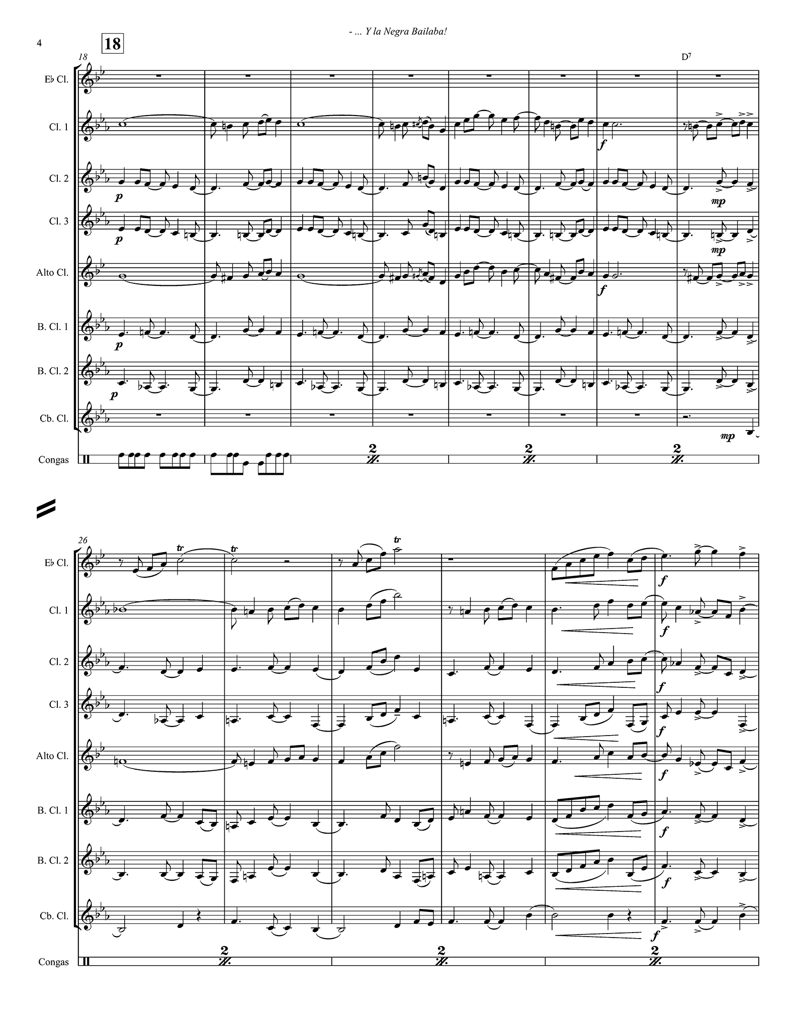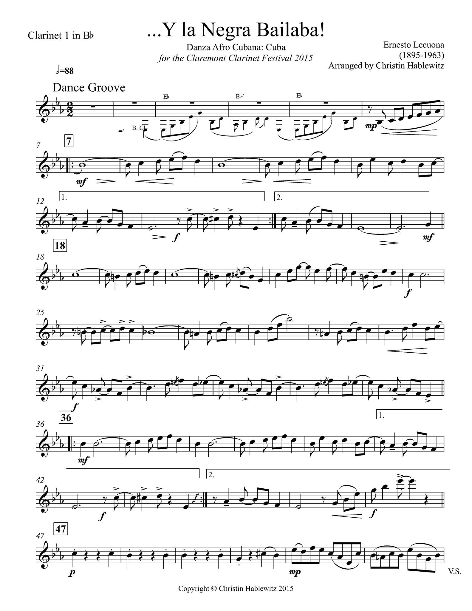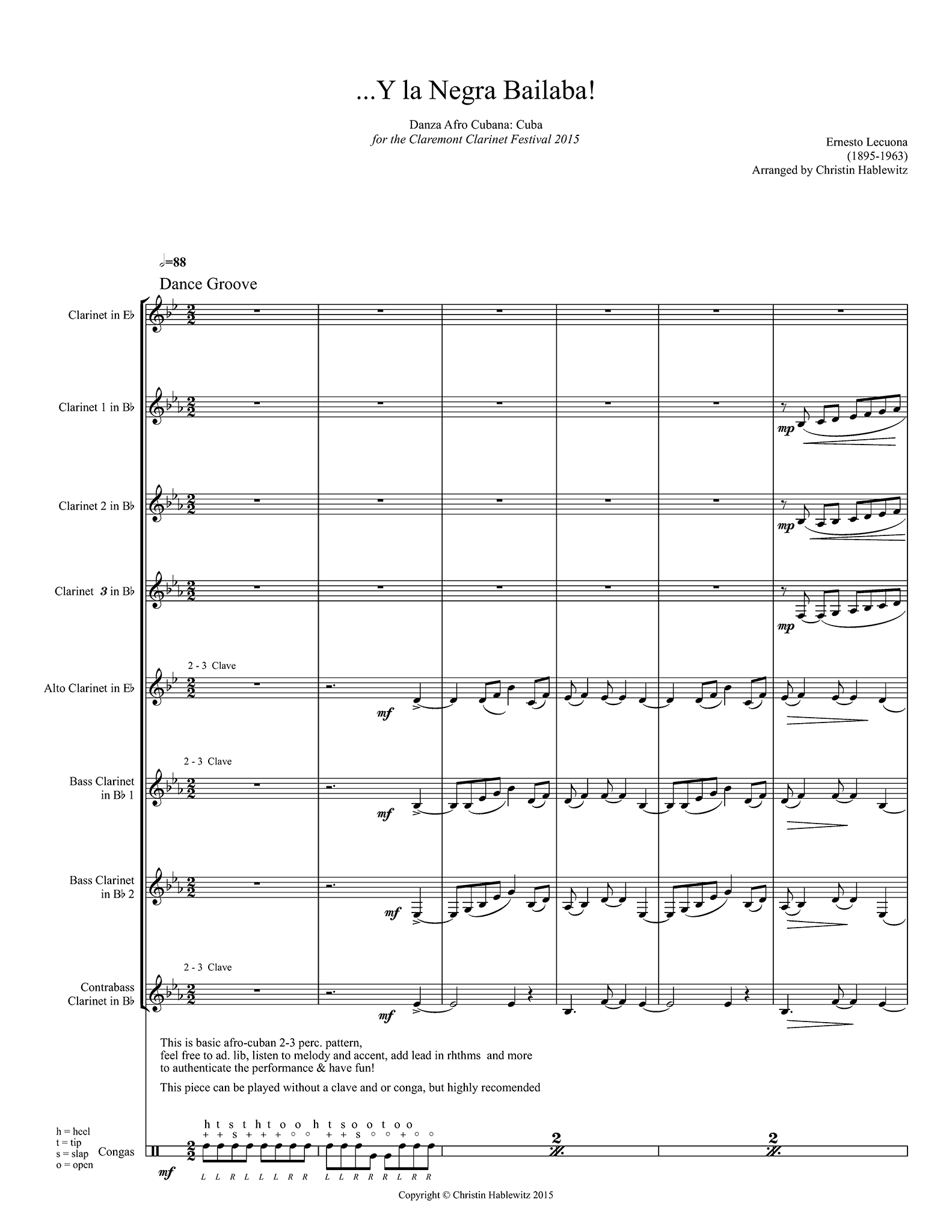 Cuban composer Ernesto Lecuouna and exemplifies his Afro-Cuban danzon style that blends musical styles of Cuba, Europe and Africa with its syncopated rhythms and unusual harmonies. The style roots to the elegant, European-based society salons and combining the idea of ‘ danza’ with ‘ Afro-Cuban’ was Lecuona’s way of mashing up society’s strict lines.This arrangement for clarinet choir and optional conga adapts this wonderful song to the clarinet choir adhering to Lecouna’s groove and main melody but adding many embellishments, texture changes and solo sections for each part. The arrangers also weaves in and a few other popular Cuban melodies you might recognize to create a joyful song that will have everyone tapping along."