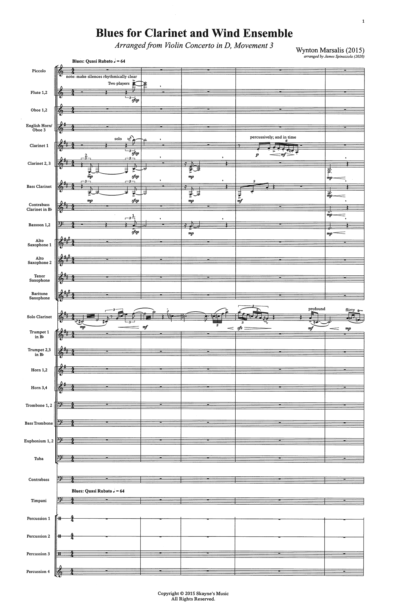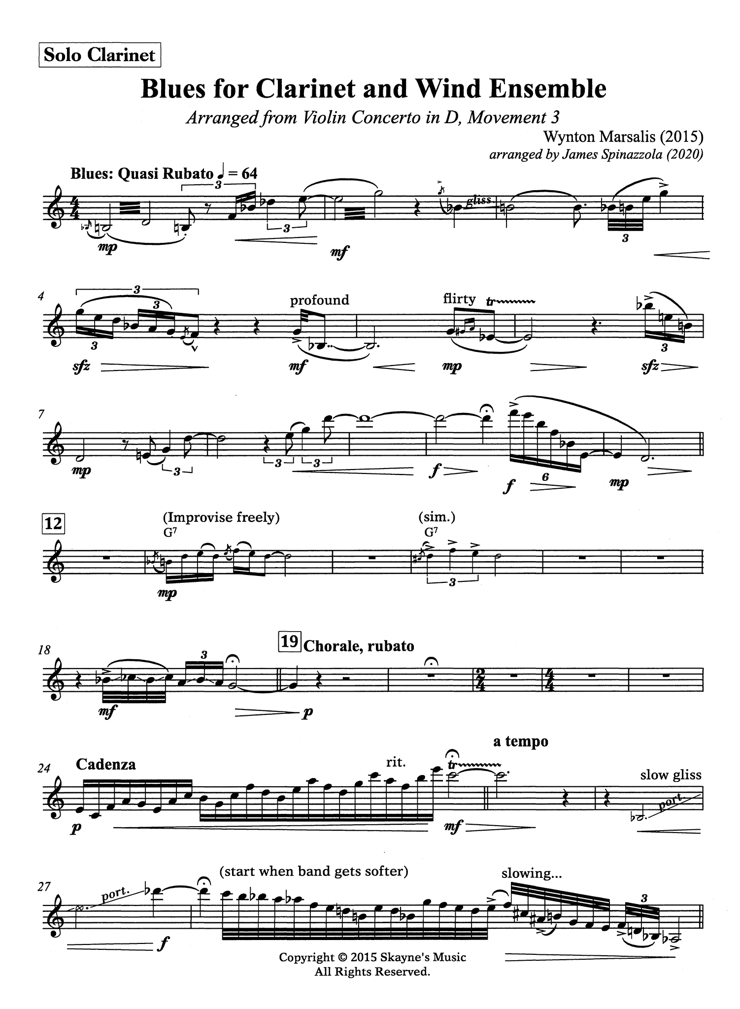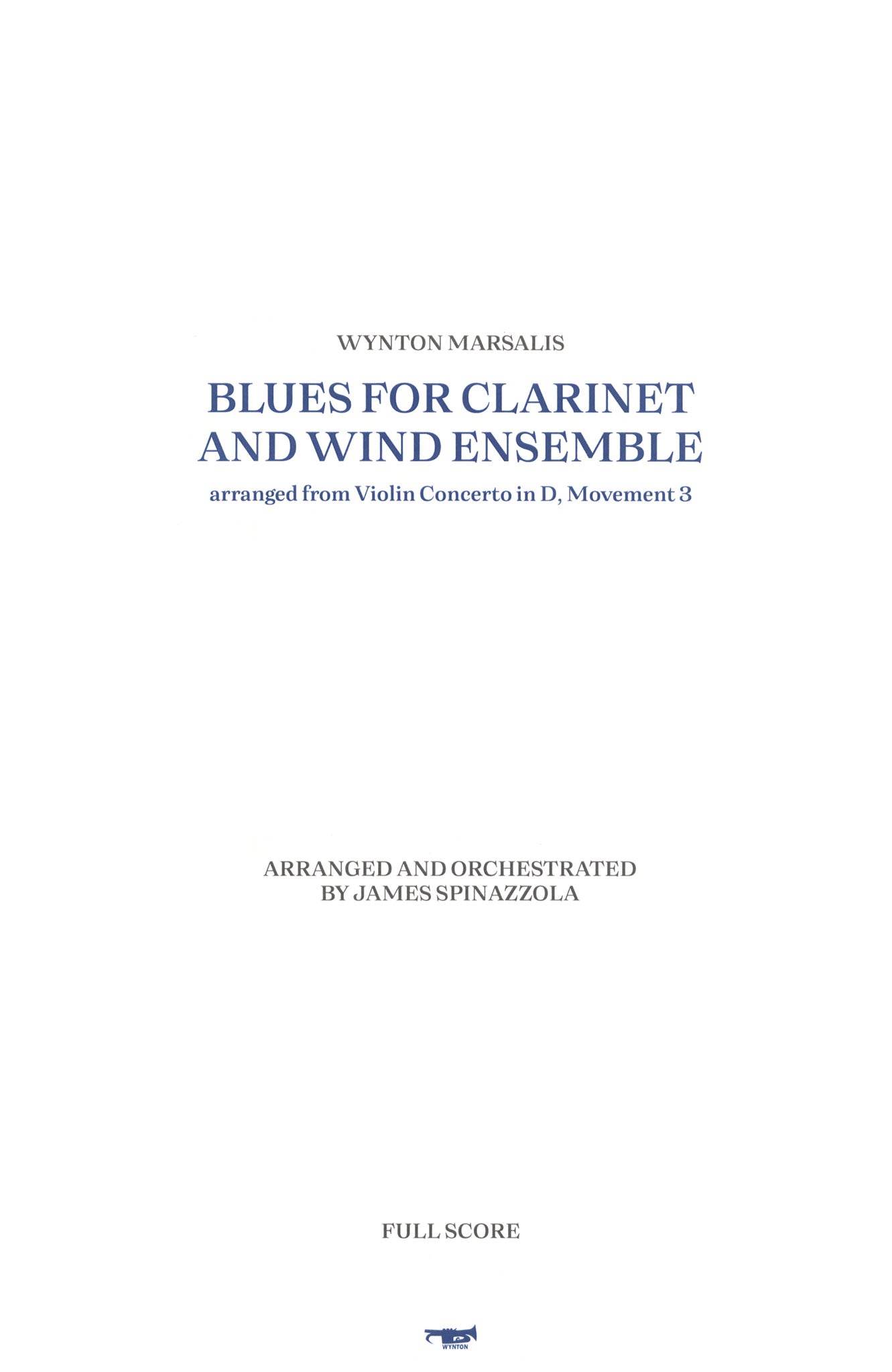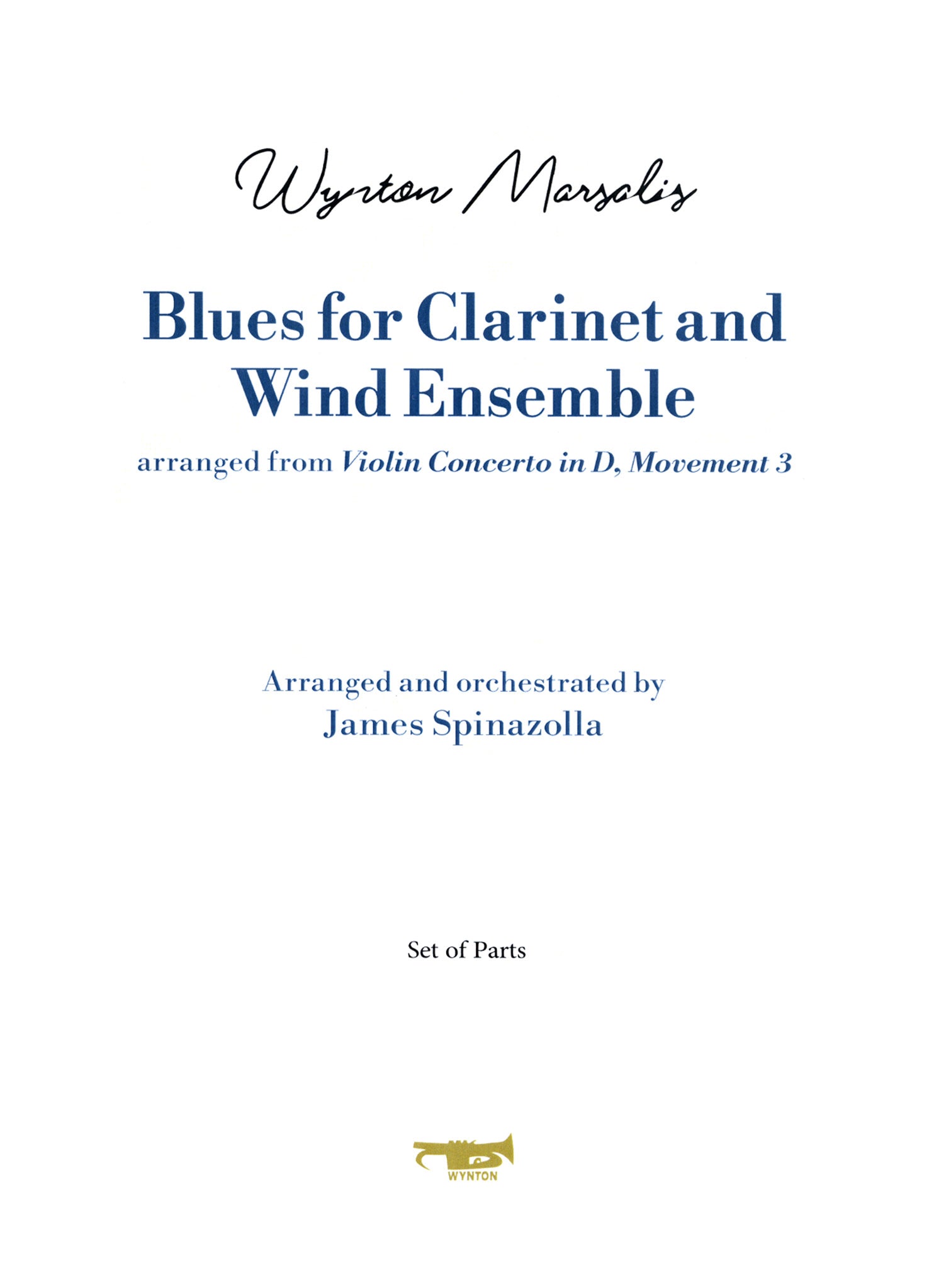 "Adapted and arranged by James Spinazzola from the third movement of Wynton Marsalis's Violin Concerto in D, Blues for Clarinet and Wind Ensemble presents a lyrical and deeply emotional side of Marsalis's stylistically wide-ranging oeuvre. The extreme expressive contrasts in this movement—ranging from "flirtation, courtship, and intimacy" to "sermonizing" to "final loss and abject loneliness"—come together to build a profound sense of grand narrative. In the liner notes for the Concerto, Marsalis writes: "We believe that all human beings are connected in the essential fundamentals of life: birth, death, love, and laughter; that our most profound individual experiences are also universal (especially pain); and acknowledging the depth of that pain in the context of a groove is a powerful first step towards healing."' -