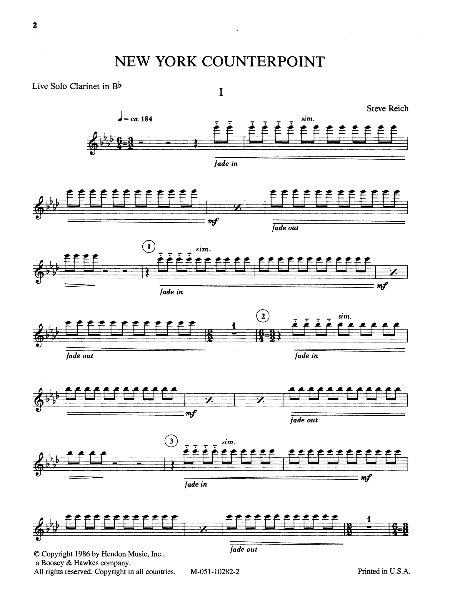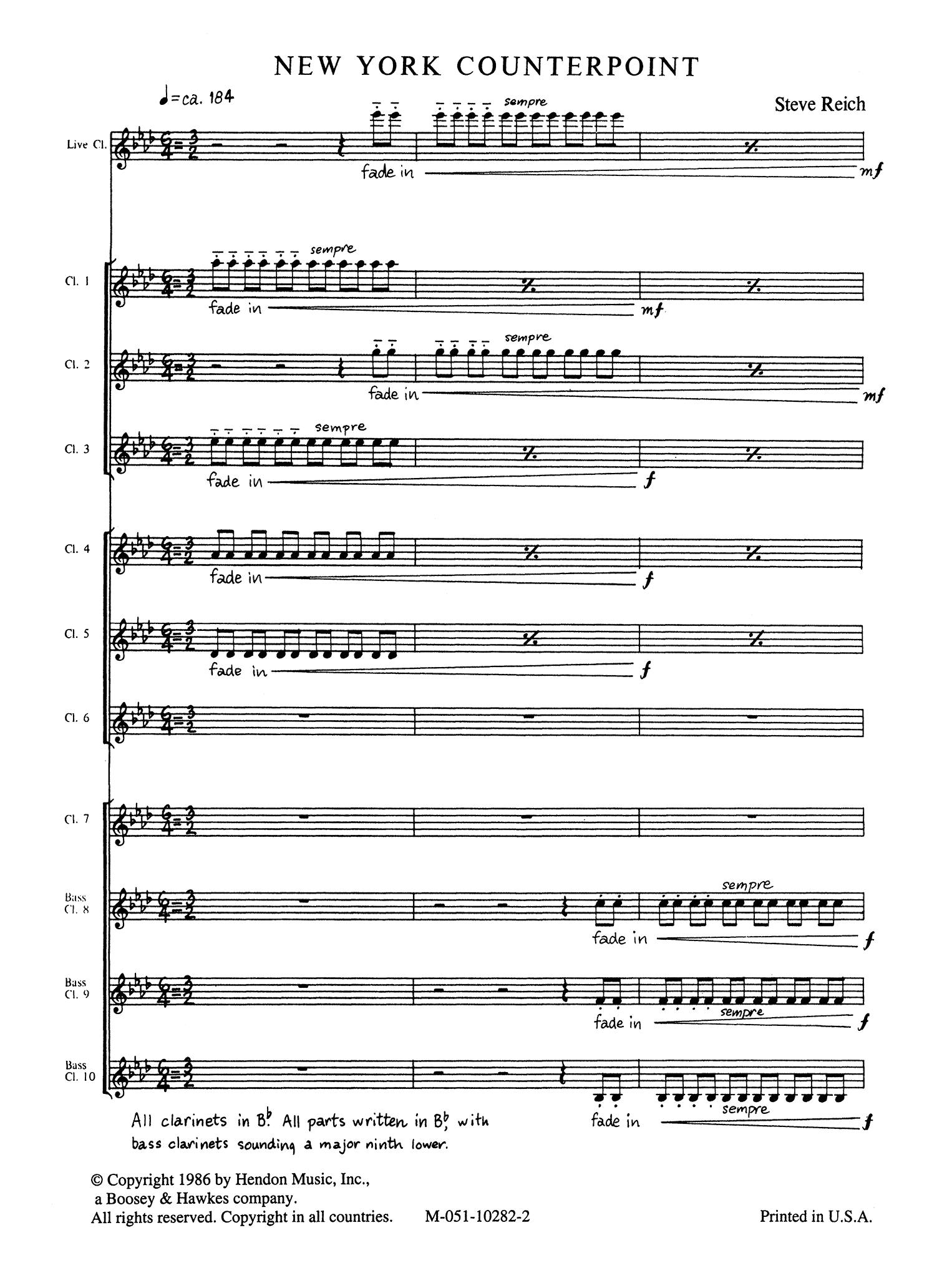The work is scored for solo clarinet and taped or live clarinet ensemble. When New York Counterpoint is performed with soloist and pre-recorded audio, the soloist should be amplified so that their volume and timbre fit properly within the recorded audio.