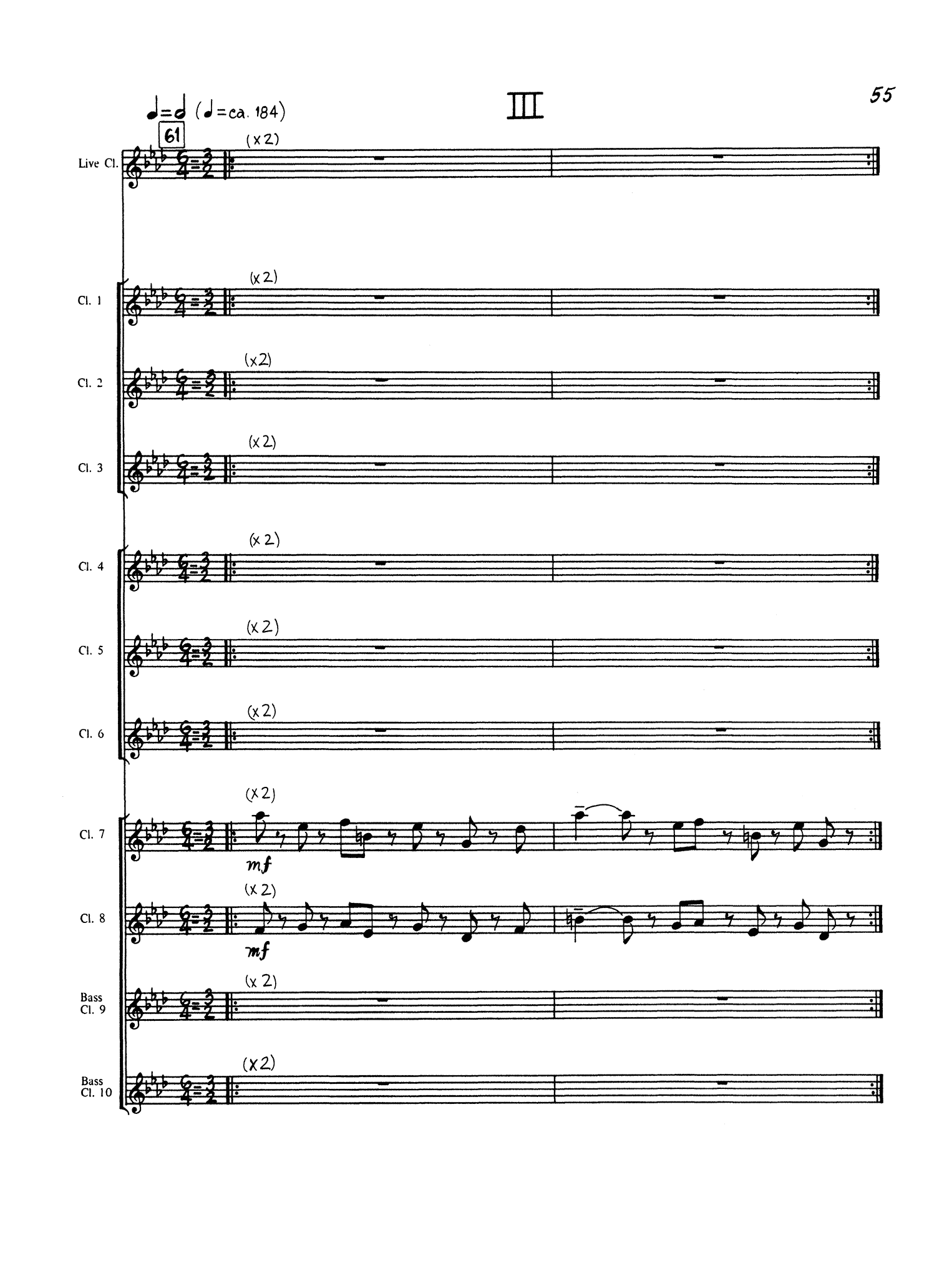 The ensemble consists of 7 B-flat clarinets and 3 bass clarinets (with one bass part doubling on B-flat). Pre-recorded performance audio or clarinet ensemble parts are available from the Hendon Music/Boosey & Hawkes Rental Library.