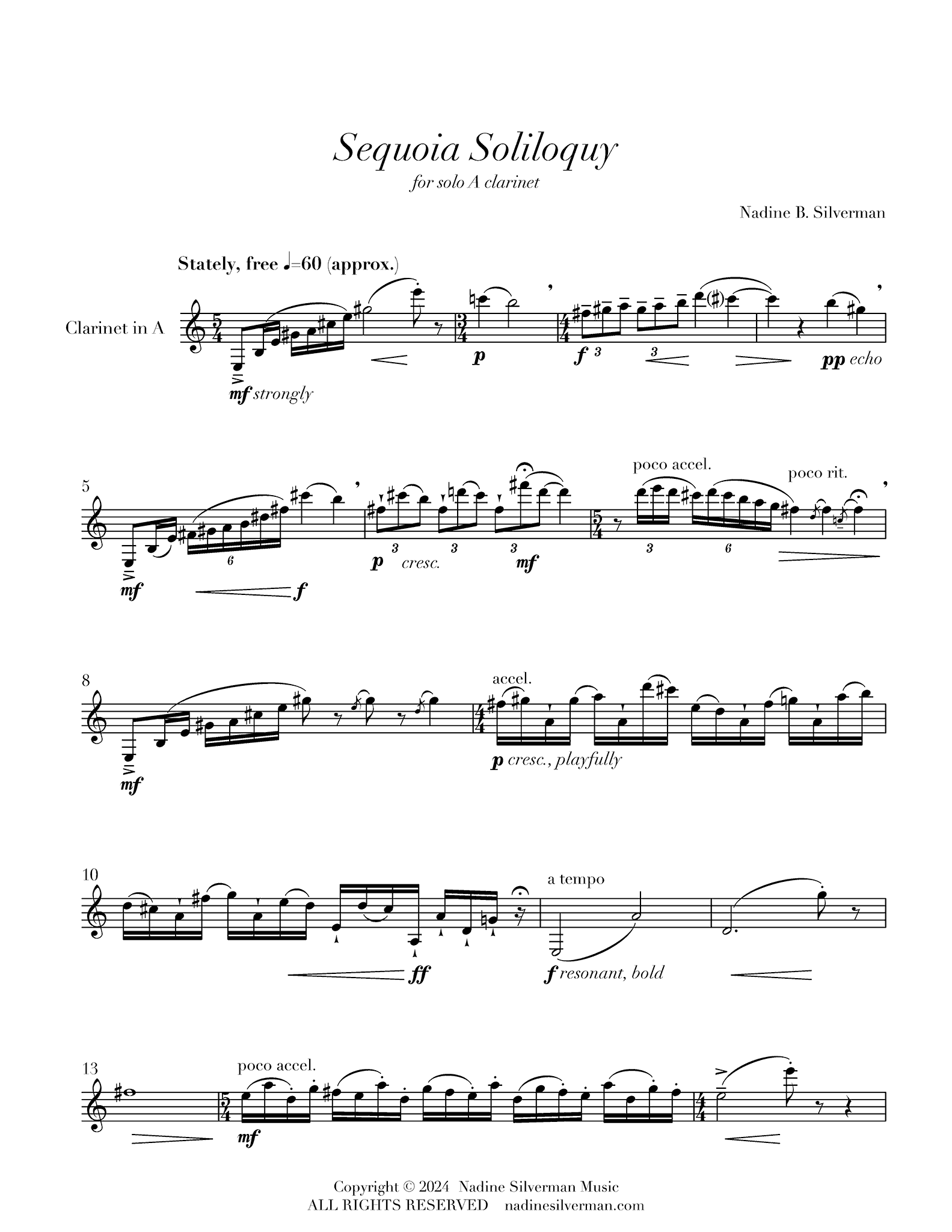 "Sequoia Soliloquy was originally written for bassoon, since I feel that the bassoon is the closest instrument, timbrally, to the sounds of a tree. It has been transcribed for other instruments made of wood. When writing Sequoia Soliloquy, I wanted to explore ideas of what a tree might say if it could speak. The piece cycles through many moods, representing the many conflicting feelings a tree in today’s world might experience, from joyful sweetness to anger and exasperation. This piece is transcribable for any instrument made of wood, for in order to hear a tree sing and lament, it has to have been cut down." -