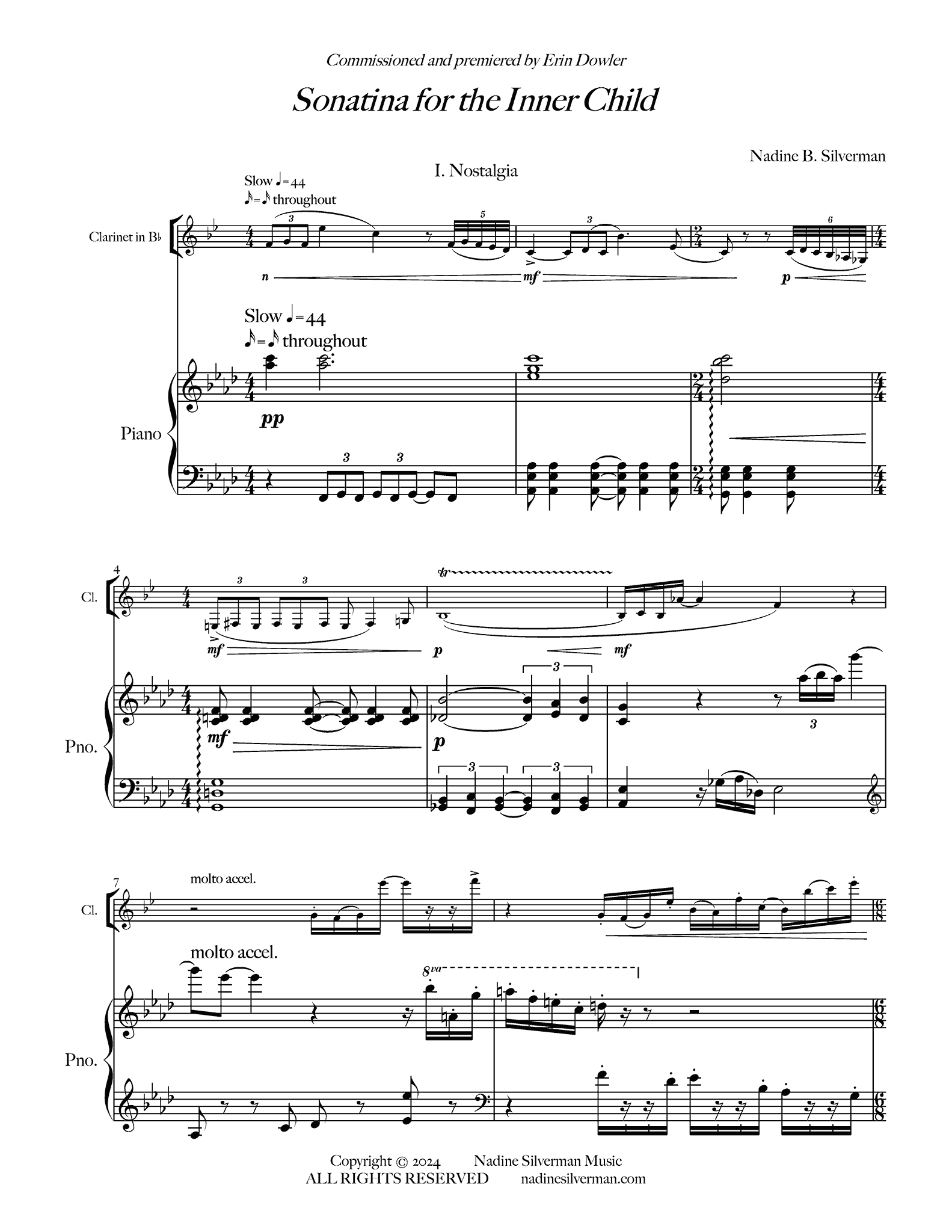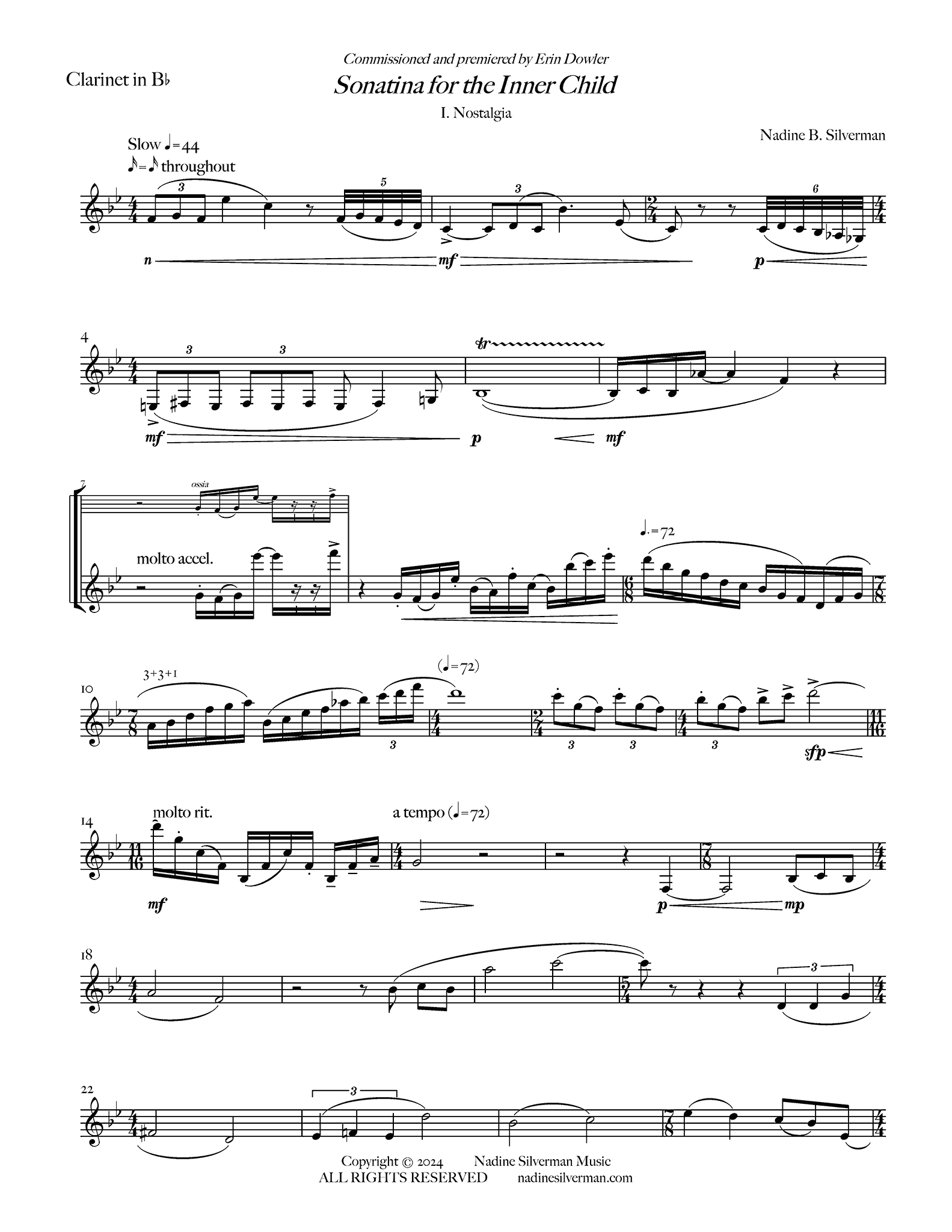 "Sonatina for the Inner Child was written for Erin Dowler’s D.M.A. lecture recital with the goal of adding a new work to the clarinet’s pre-college and early college repertoire. When writing, many hours were spent considering my level of playing at the pre-college stage, so my own inner child made her way into this piece of music. as a result, Sonatina for the Inner Child explores two perspectives presented as conjoined movements: one of nostalgic reflection, and the other of the spontaneity and whimsy of releasing that inner child as an adult with satisfying abandon." -