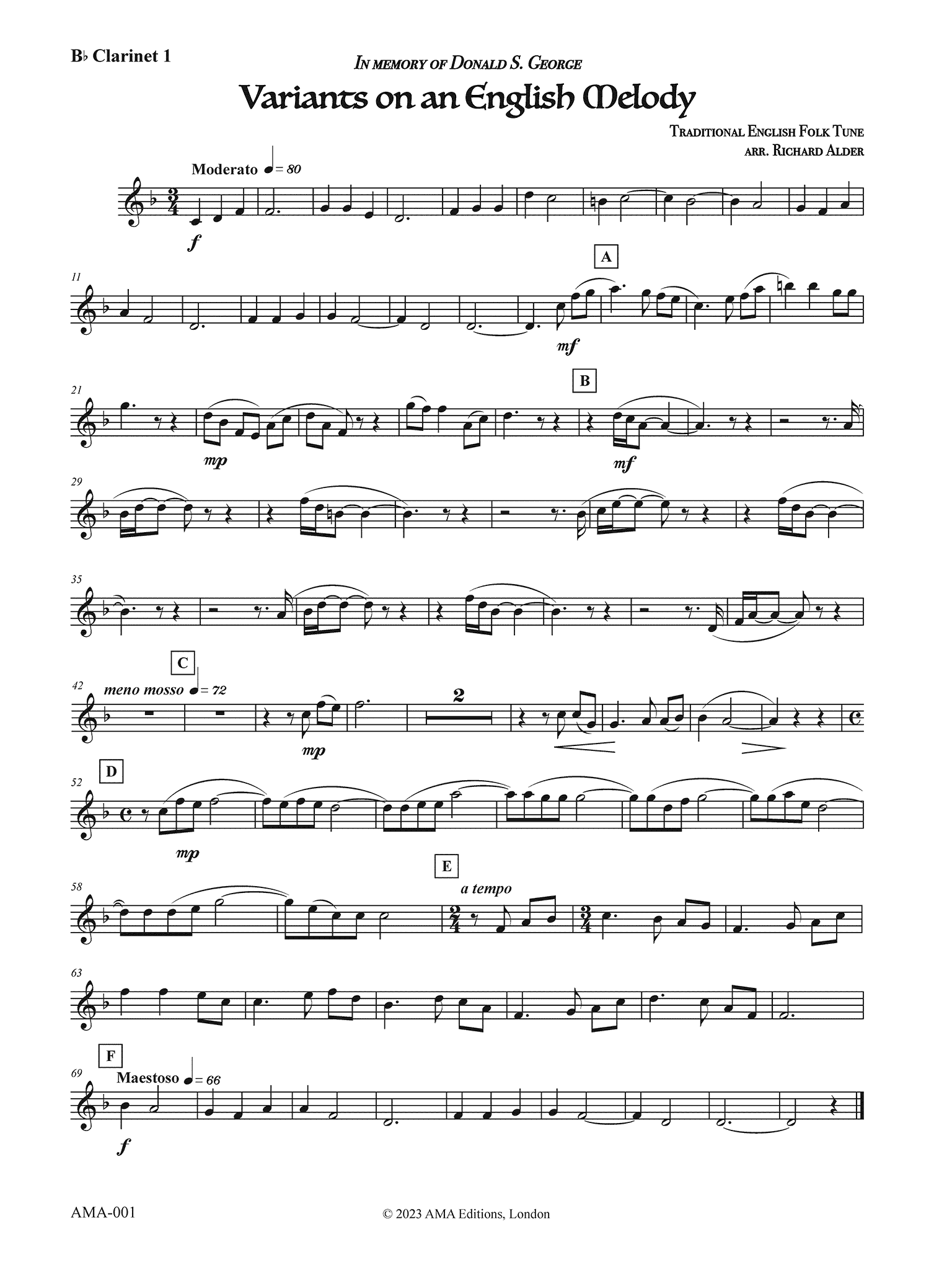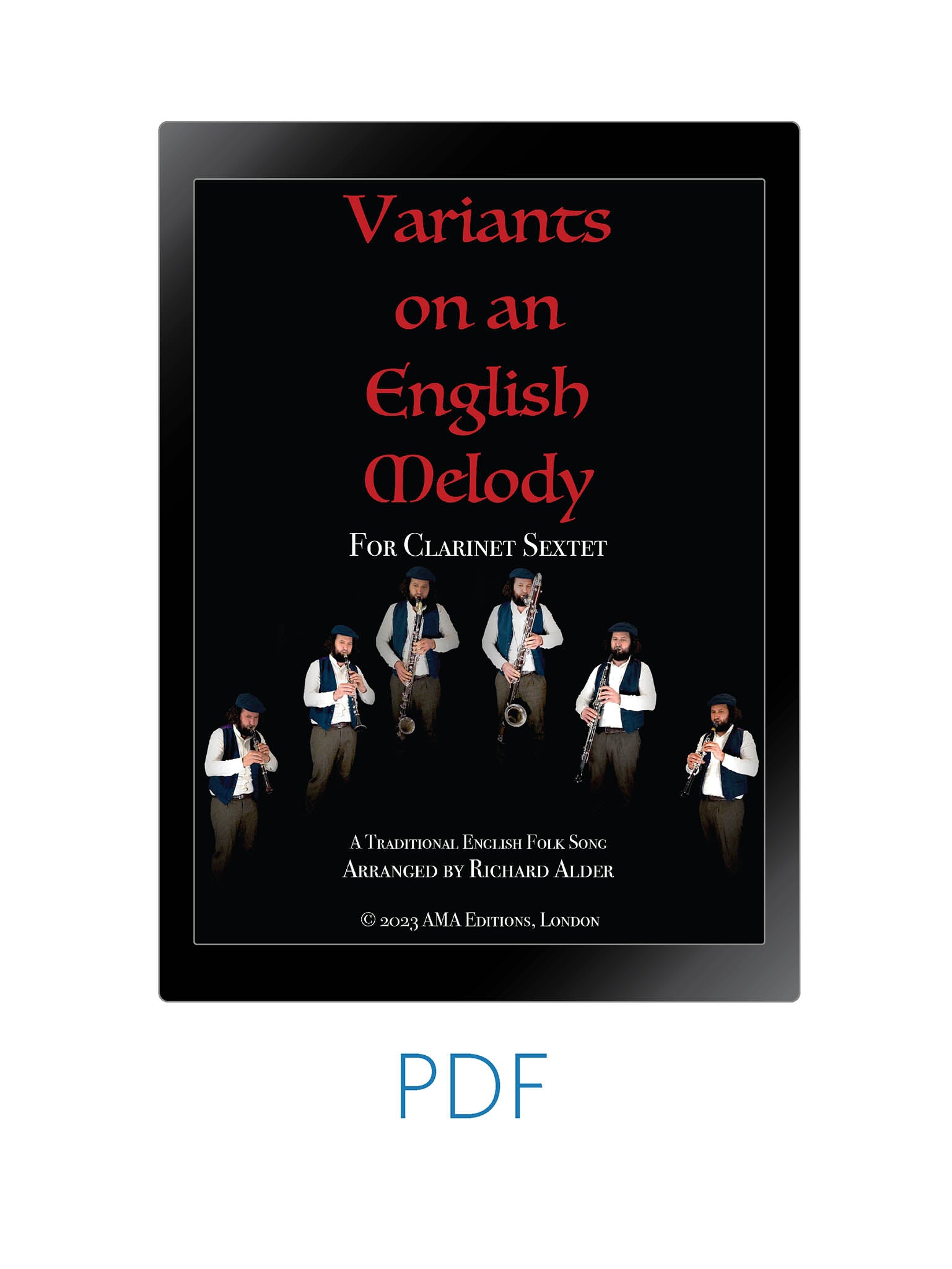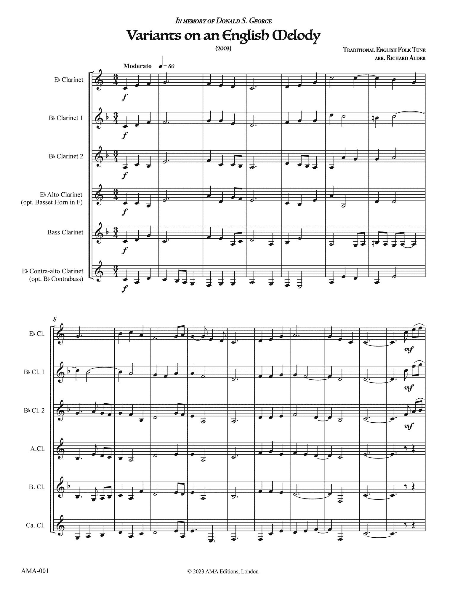 "Variants on an English Melody is a theme with orchestrational variations of a traditional English folk song. In the second variation, the alto clarinet, being the middle register voice, has the solo line while the accompaniment figure is passed around and through the whole range of the ensemble. The E♭ Contra-alto is the preferred instrument for the bottom voice, as it creates a more balanced blend with the ensemble, however, a B♭ Contrabass part is included if one is not available. A Basset Horn part is also included as a possible substitution for the Alto Clarinet."