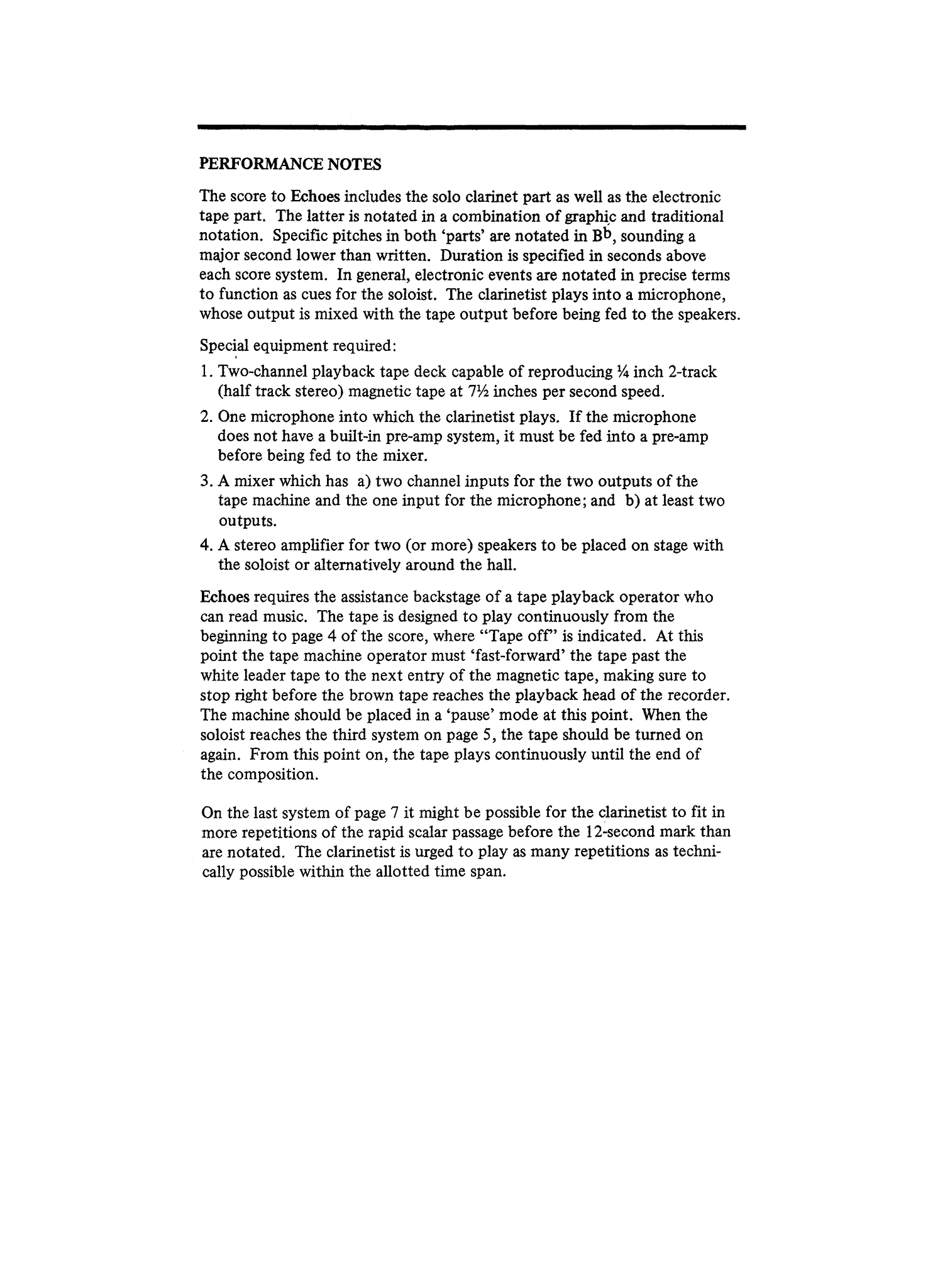 "Echoes was commissioned by the clarinetist Phillip Rehfeldt and the composer Barney Childs in 1974 as part of a project to stimulate the composition of contemporary chamber music for “clarinet and friend” (i.e. clarinet and piano, clarinet and electronic tape, etc.). As the titles implies, Echoes is based on a continuous interaction between the clarinet and the electronic sound source which share common pitches, timbres, and musical gestures, while simultaneously developing a larger musical shape. The work contains three organically related sections which gradually evolve from one another in a single continuous movement. The tape portion was produced at the University of California, Berkeley, Electronic Music Studio. In performance, the output of the clarinet is amplified and mixed with that of the pre-recorded electronic tape which is then projected from multiple speakers, placed on the stage or (ideally) around the hall." -